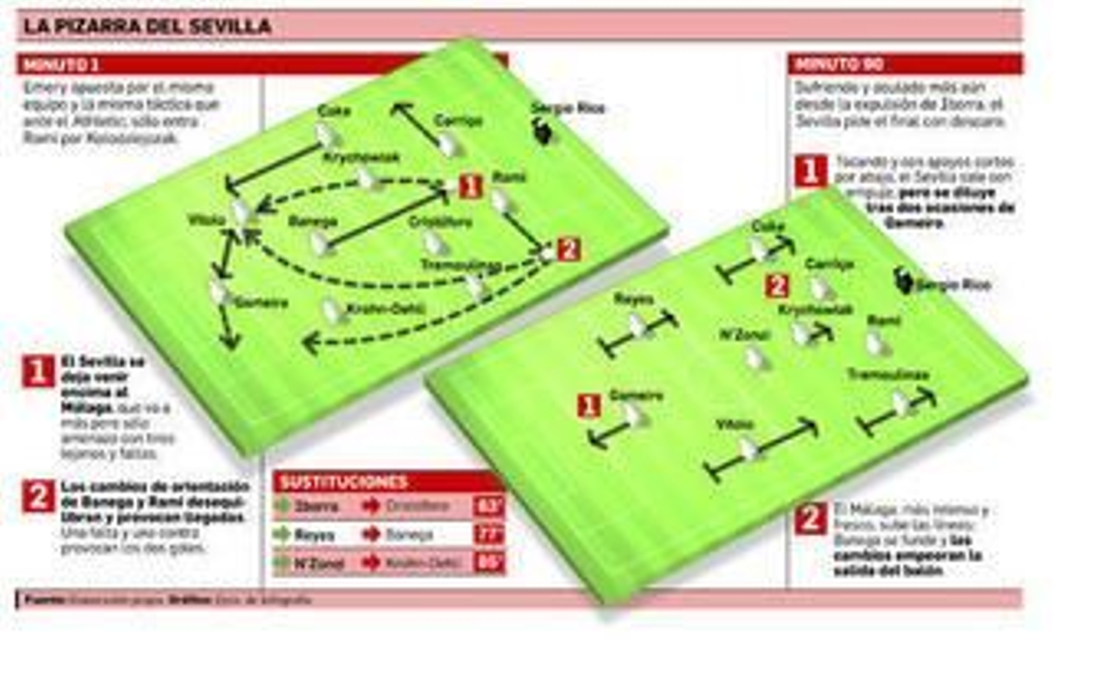 Plan casi calcado de Unai Emery para vencer a otro correoso y físico rival, con la diferencia de que en esta ocasión el sufrimiento fue un poco mayor porque el Málaga sí vio puerta y por la evitable expulsión de Iborra. Los cambios ayudaron muy poco a cerrar un partido que estaba demasiado abierto pese al 2-0 cobrado en la primera mitad. Iborra sólo apareció para hacer dos faltas amonestables casi seguidas y Reyes no retuvo el balón, ayudó poco atrás y no apareció para mejorar la posesión. La defensa tuvo que fajarse para evitar el empate. Al plan, basado en atraer la presión adelantada del contrincante para sorprenderlo con cambios de orientación o rápidas conducciones por abajo, le faltó defender con el balón. Cuando se fundió Banega, el equipo se cayó y se aculó en exceso.