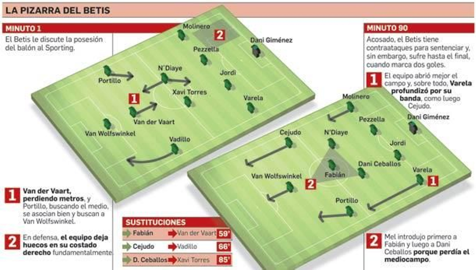 Van der Vaart perdió metros para organizar y Portillo dejó la banda para ayudarlo. El Betis tuvo buenos momentos y en un pase del holandés a su compatriota Van Wolfswinkel llegó el empate. Tras el 2-1 gijonés, la falta de fuelle de Van der Vaart fue decisiva para no sentenciar a la contra, que sí aparecería más tarde con Varela y Cejudo entrando por fuera.
