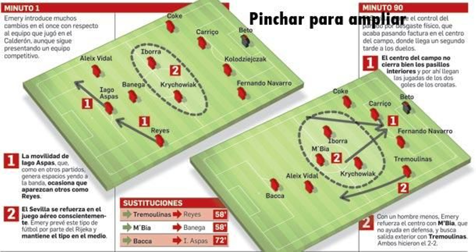 Emery, a diferencia del partido en el Calderón, se pertrechó en la batalla aérea con laterales más dotados para el salto como Coke y Fernando Navarro y un pivote como Iborra junto a Krychowiak. El Rijeka no encontró huecos por las bandas, bien cerradas por dos hombres de convicción defensiva, pero fue encontrando espacios por el centro conforme el desgaste físico por tanto choque, sobre todo en el caso del polaco, fue haciendo mella. A ello se unía que Banega no ayudaba unos metros más arriba y que M'Bia, que salió fresco, tuvo una actitud poco solidaria con el grupo en el esfuerzo cuando el equipo sufría mucho por el centro.