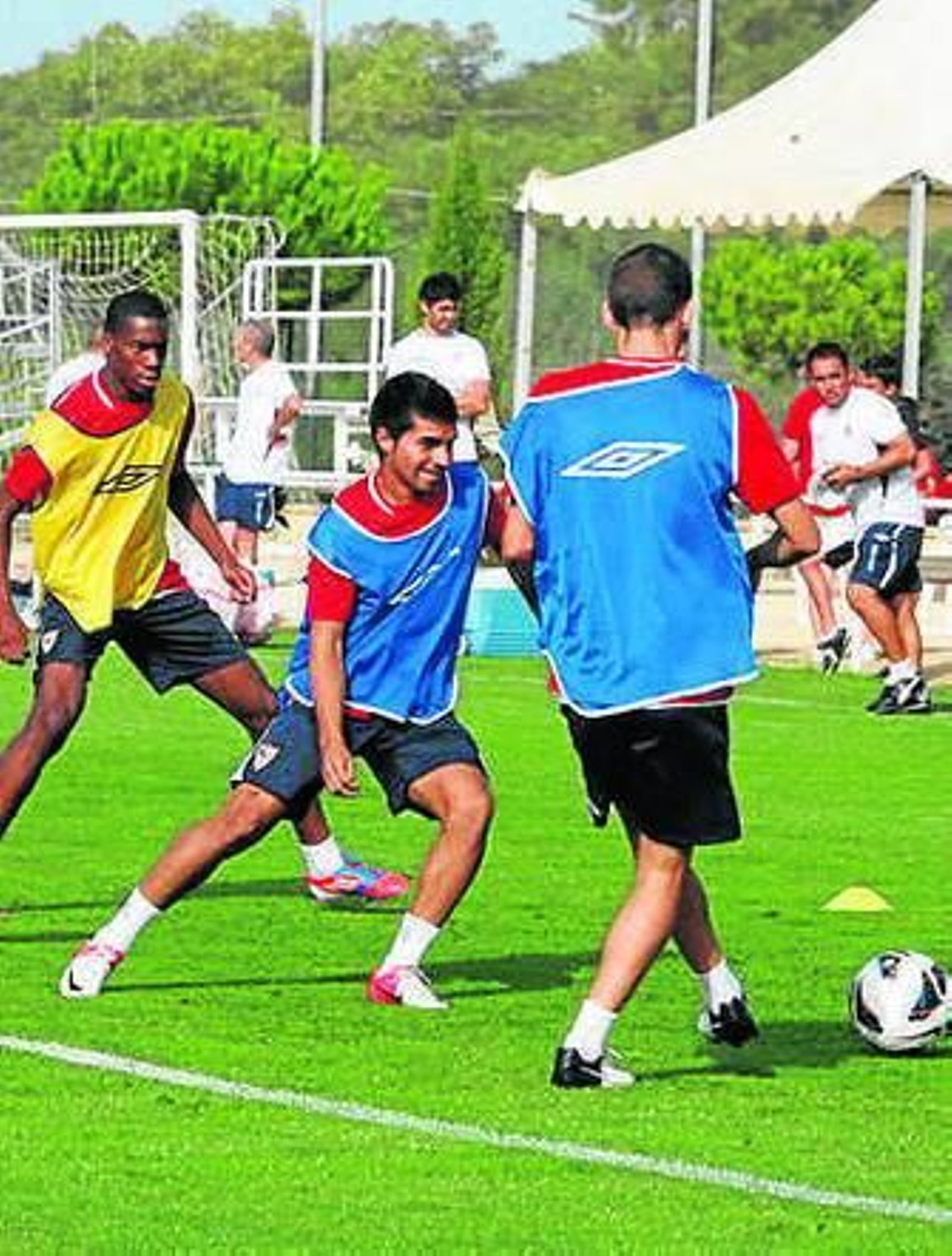 El primer entrenamiento sevillista arrancó a las nueve y media en el campo de fútbol de Costa Ballena. La novedad tras varios días de ausencia fue Jorge Andújar Moreno, Coke.