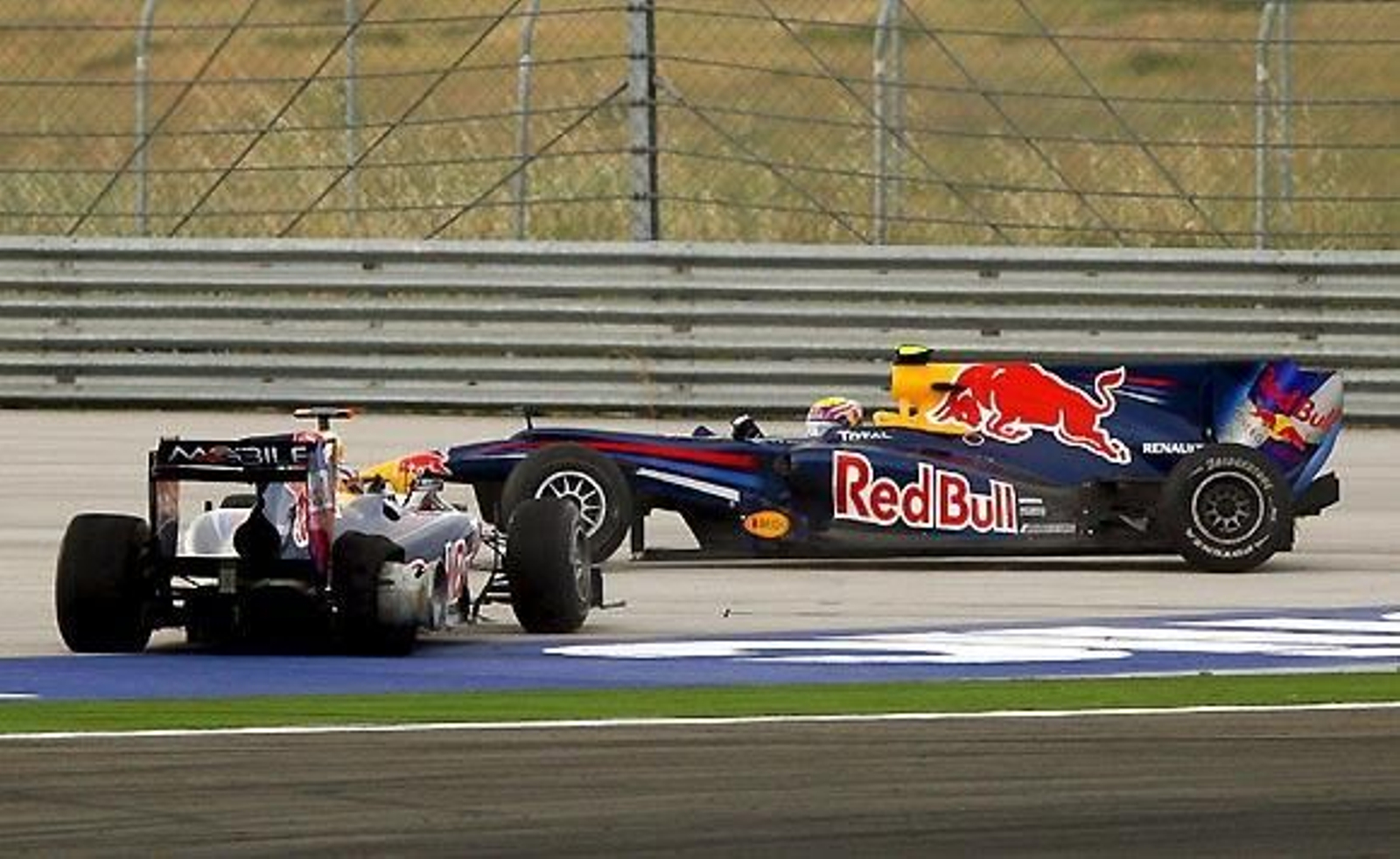 Sólo Red Bull podía perder un doblete hecho. Y la escudería se suicidó. A 18 vueltas para el final, Vettel trató de adelantar a Webber en una de las rectas. Ambos se tocaron. El alemán quedó fuera de carrera y le echó la culpa a su compañero, al que tildó de "loco" llevándose el dedo índice a la sien. El australiano tuvo que cambiar el morro de su coche, pero se mantuvo en carrera en tercera posición. "Obviamente no soy el hombre más feliz de la tierra", dijo Vettel, muy molesto. "Nunca deberían haber llegado a esa situación. Depende de los pilotos respetarse y darse el espacio necesario", dijo Horner.