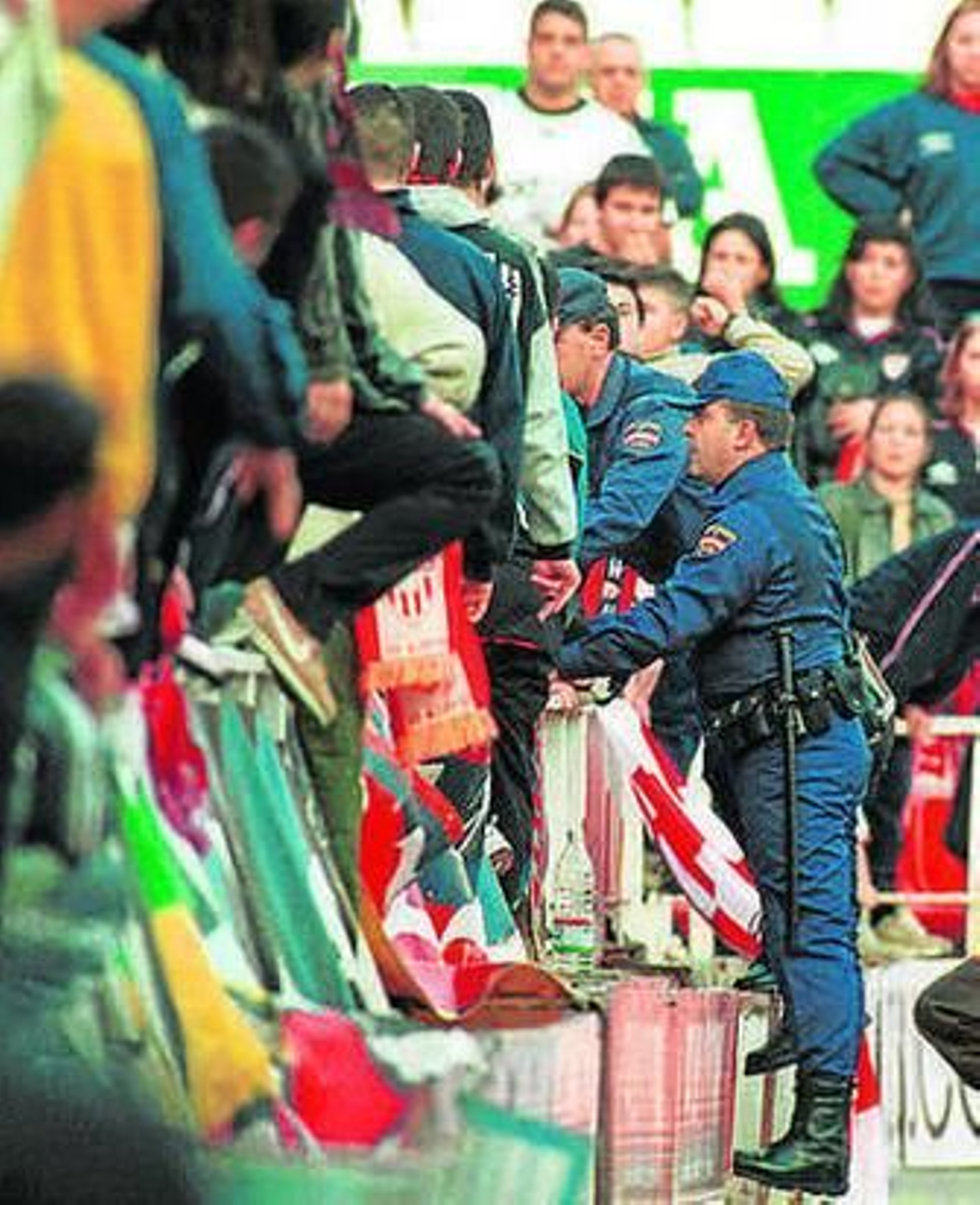 Los cuerpos de seguridad intervinieron a un grupo de aficionados drogas como cocaína,marihuana y hachís, así como un contenedor con bebidas alcohólicas en botellas de cristal y otros objetos ilegales como navajas, bengalas y pegatinas con símbolos fascistas.