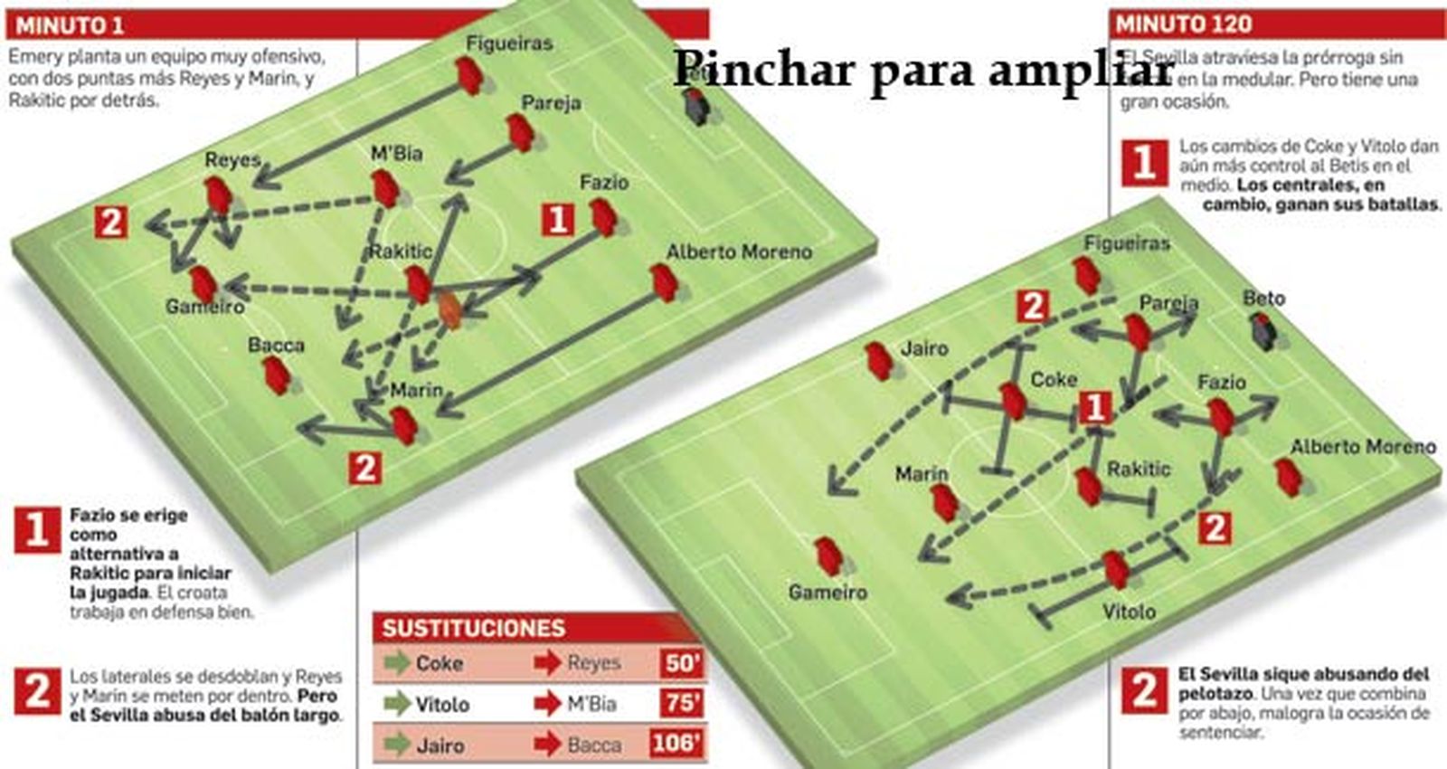 El Sevilla sólo sostuvo el pulso en la sala de máquinas mientras a M'Bia le duraron las fuerzas, que fue hasta el descanso. En esa primera mitad, Rakitic se sacrificó y se multiplicó para ayudar en la resta y lo hizo. Hasta ganó balones colgados desde atrás. Pero M'Bia estaba para un rato, como anunciaba Emery, y duró lo que duró. De hecho, desde el minuto 46 hasta el 75, que fue relevado por Vitolo, el espigado medio africano perdió la colocación y ese brío que le hizo ganar balones divididos y anticiparse a su par en la primera parte. Unai ubicó a Coke como pivote cuando prescindió de Reyes en el minuto 50, pero el experimento no cuajó. El madrileño ni hizo la raya, ni tomó buenas decisiones con la pelota. Encima, Rakitic empezó a pagar su derroche físico. Y los de atrás no iban a esperar que Marko Marin les echara una mano en el repliegue...