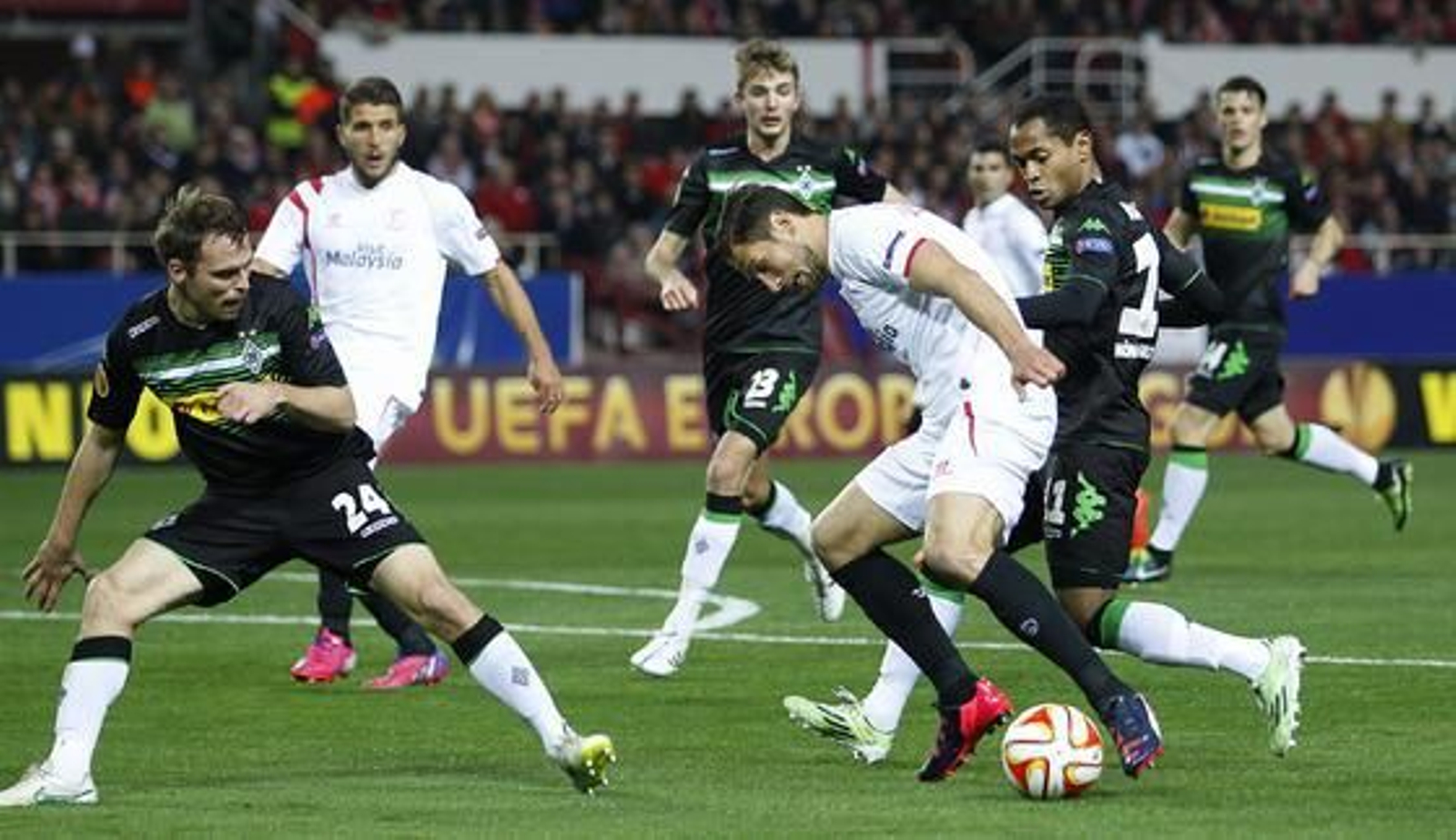 Claro que con Reyes también podría haber marcado un gol para irse a Alemania con idéntica renta, pero más allá de eso lo que resultó incuestionable es que el equipo ganó en solidez. El planteamiento de juego, en definitiva, cambió por la sencilla razón de que la piscina dejó de tener dos agujeros por donde se escapaba el agua, concretamente Banega y el propio Reyes, y la ayuda en la presión de Aleix Vidal fue fundamental para que el Borussia Mönchengladbach se sintiera hostigado a partir de ese momento. Además, el movimiento de ajedrez también conllevaba la consecuencia de que Figueiras le cerrara el carril a Wendt y que incluso fuera el Sevilla quien atacara por esa banda en lugar de sufrir como hasta entonces.