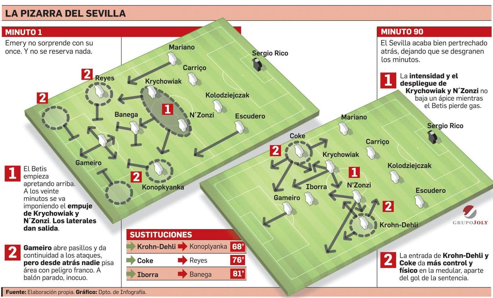 Un partido es una carrera de fondo. Y tras 20 minutos de efervescencia verdiblanca, la fuerza y resistencia de Krychowiak y N'Zonzi, la ayuda de Mariano y Escudero abiertos y unos centrales cómodos a campo abierto ahormaron el partido a conveniencia de los anfitriones. Ya se trataba de insistir, a balón parado, en una jugada elaborada o pillando a la zaga bética saliendo y desguarnecida, como ocurrió en el 1-0.
