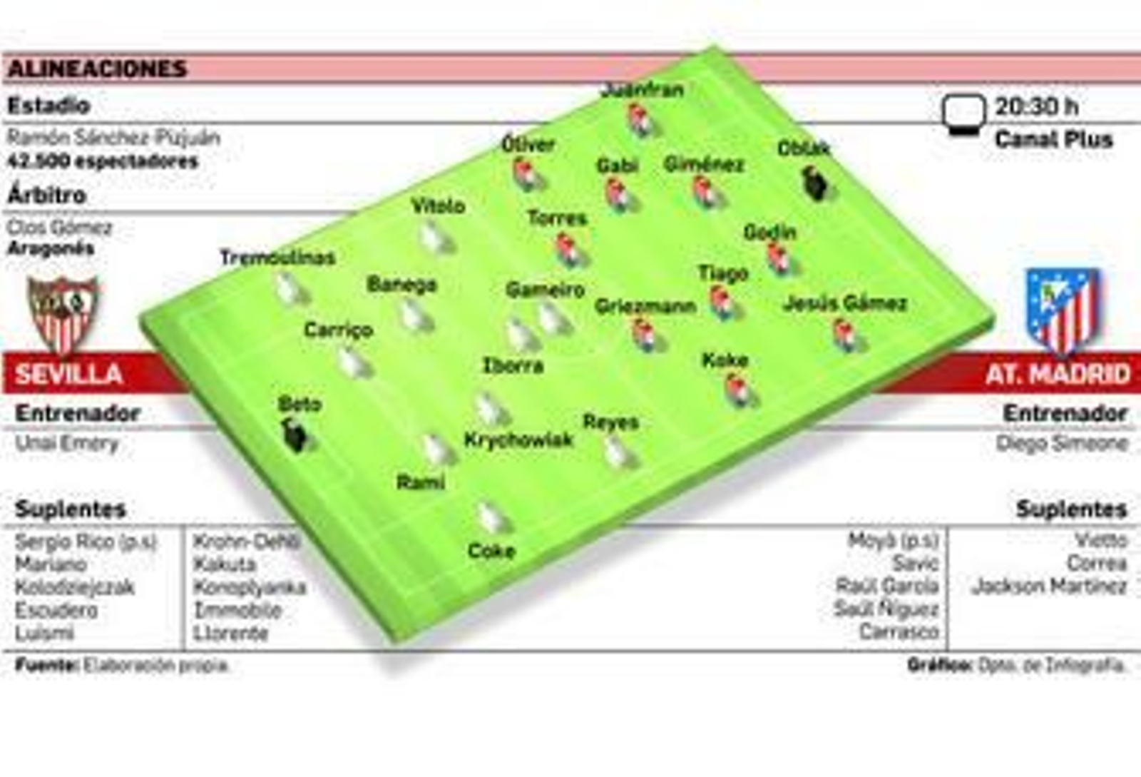 Emery tirará de la base del curso pasado para comenzar a darle el engranaje necesario al bloque y la idea de que Llorente sea titular choca con esta premisa. Es improbable que un jugador con dos días de entrenamiento adelante a los que llevan peleando por un puesto todo el verano. Pero Llorente jugará, aunque sea como revulsivo o pararrayos de toda esa energía positiva. Carriço llega a la cita para acorazar el eje y que Krychowiak vuelva a su sitio en la medular: hoy será ahí más necesario que nunca. Enfrente, el Atlético de Simeone. Líneas juntas, presión asfixiante y la electricidad de Koke, Óliver y Griezmann esperando el mínimo resquicio. Jackson Martínez, como Llorente, aguardará turno. Ambos partirán como espectadores de privilegio hasta que les toque saltar al ring. Vaya partidazo que se atisba...