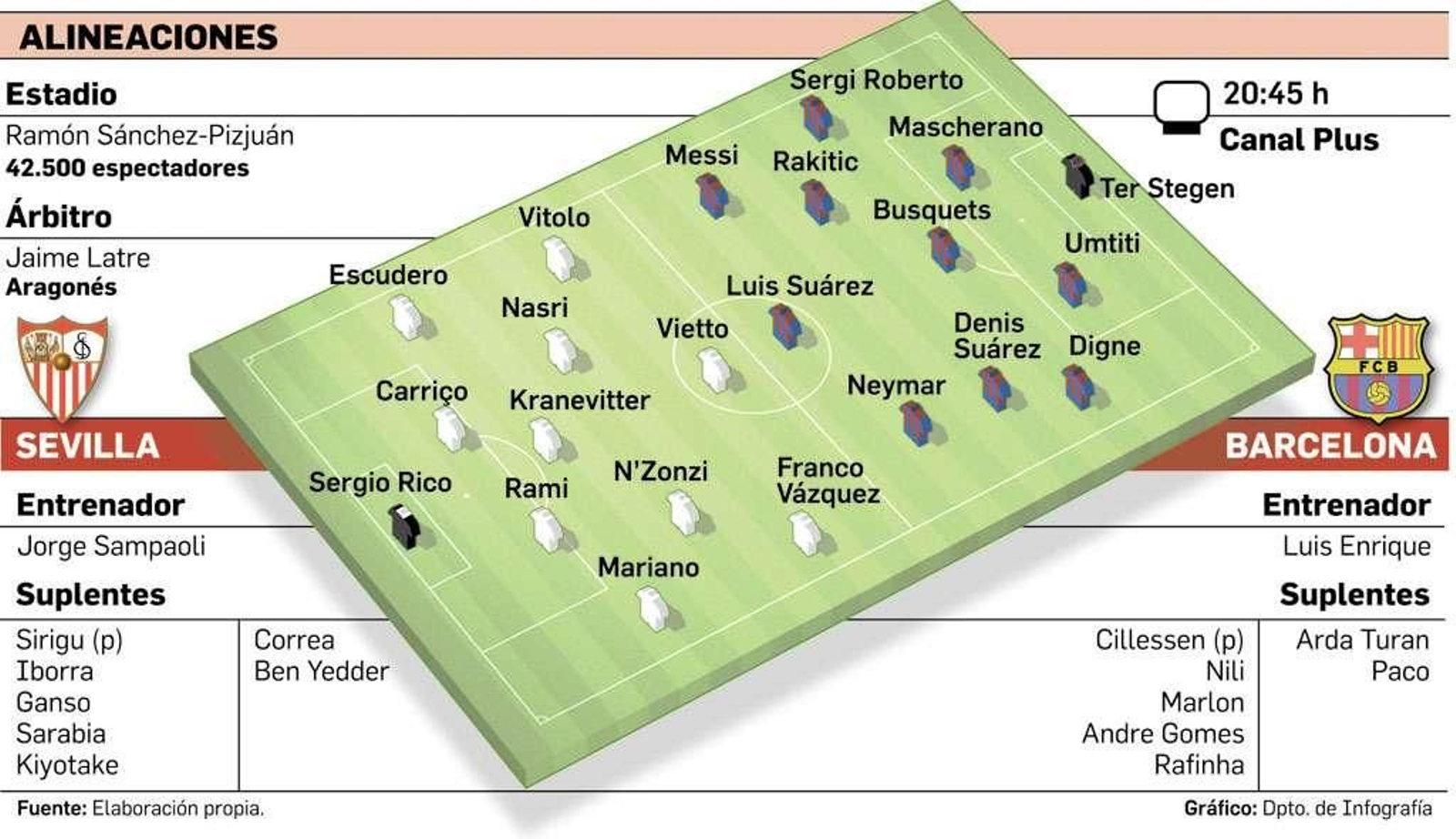 En este caso, y dependiendo de la prueba que hoy se hará Nasri, el francés entraría en el once por Ganso. Enfrente estará un Barcelona que llega con la defensa cogidita con alfileres, igual que lo está la del Sevilla. La baja por sanción de Mercado se une a la muscular de Pareja, con lo que el propio entrenador descartó el dibujo de tres centrales, en una vuelta obligada a la de cuatro defensas. Pero más que la defensa, hay que mirar lo que habrá de medio campo para adelante entre dos escuadras que van a retarse en un precioso pulso por hacerse con el balón en propiedad, curiosamente, con dos esquemas muy similares. La diferencia estriba en la calidad entre el tridente ofensivo azulgrana, Messi, Luis Suárez y Neymar, y el que podría ofrecer el Sevilla. Pero que el balón va a ser discutido es indiscutible. Y que la pelea en el medio campo va a ser épica, también. Porque si Nasri juega acompañando a N'Zonzi puede que hasta tenga ventaja ahí el Sevilla sobre el Barcelona. El crecimiento sostenido lo ha llevado hasta ahí. Ahora queda hacer patente esa realidad.