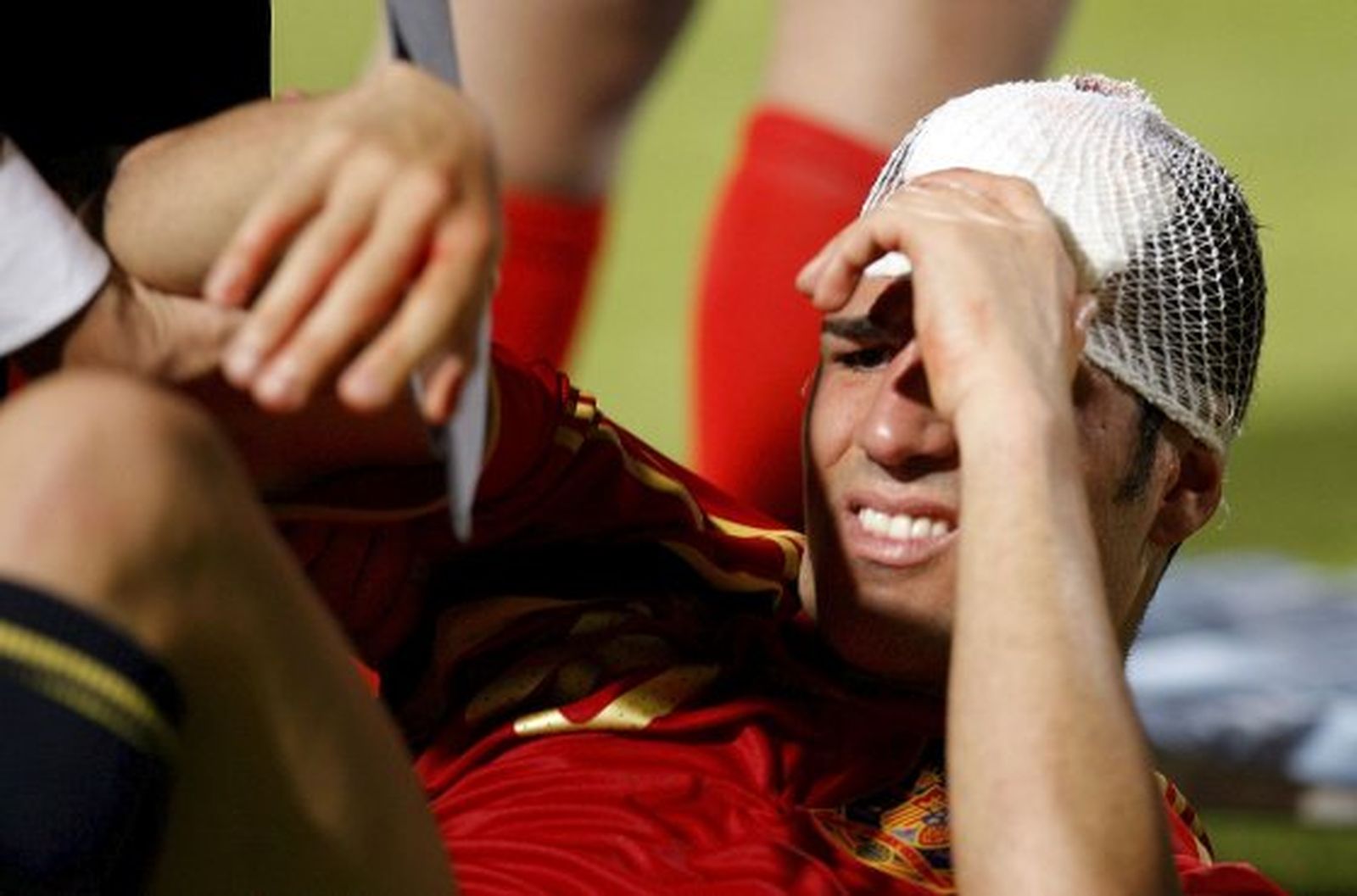 Fue el momento en el que el miedo pasó por el cuerpo de todos. Cesc fue derribado por dos rivales dentro del área y en la caída se hizo una brecha en la cabeza que llenó su rostro de sangre. Ante los gestos de sus compañeros, el banquillo y la grada pensó que podía haberse dañado el tabique nasal. Todos respiraron cuando comprobaron que se quedó en un susto y con Fábregas retirándose aturdido hubo tiempo hasta para gestos innecesarios, como la foto que le tiró Piqué con su móvil entre risas.