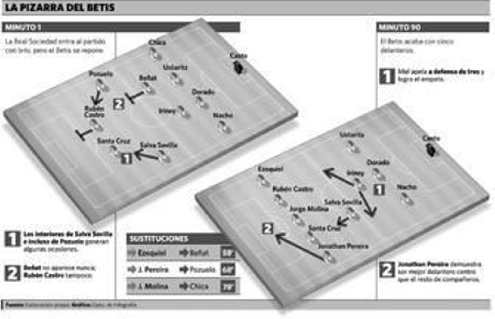 La inclusión de Salva Sevilla dotó al equipo de pase, como quedó demostrado en el 1-2. Además, le otorgó algo de pulso al juego. Pero Beñat se ausentó del partido por enésima vez, igual que Rubén Castro. Santa Cruz hace lo que puede y sólo Pozuelo ayudó en el embudo, que desatascaron Ezequiel y Jonathan Pereira.