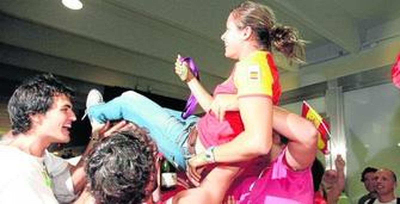 Abrazos, besos, fotos, autógrafos y manteo. Flores para la campeona. Sus compañeros y amigos del Club Náutico la hacen volar y rozar el cielo, el cielo que alcanzó el 7 de agosto de 2012 colgándose la medalla de oro.
