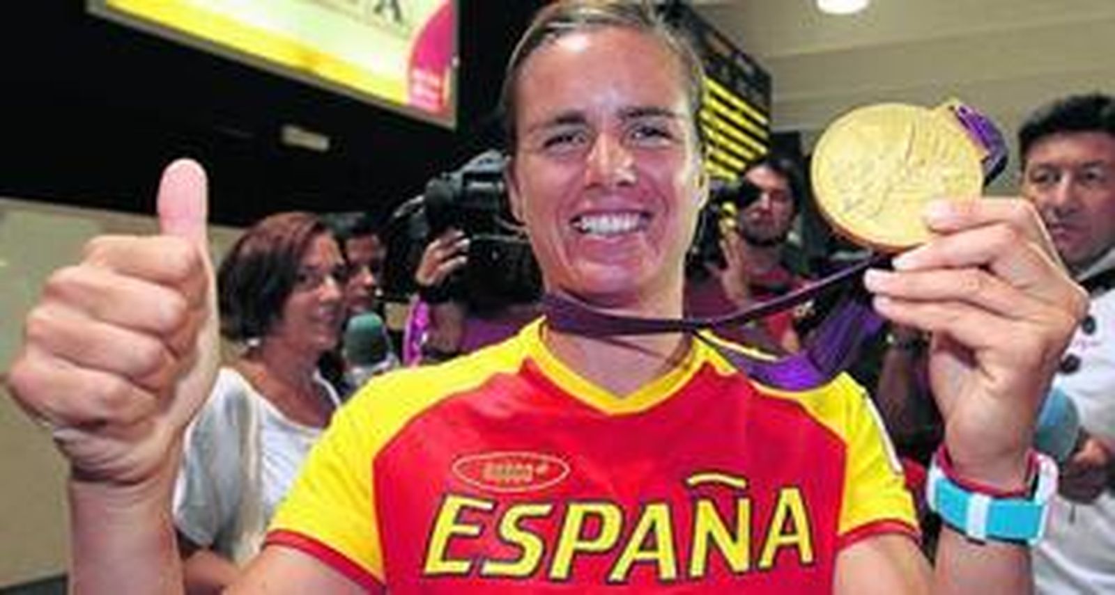 Se hace esperar la campeona olímpica. Es la última en recoger su equipaje. ¿Por qué siempre que esperas a alguien éste es el último en salir? Eterna pregunta sin respuesta. En el caso de Marina, una de sus maletas se ha extraviado. La proximidad horaria del vuelo Madrid-Sevilla con el Londres-Madrid trastoca las pertenencias de la campeona, aunque "vienen de camino". La medalla, que es lo realmente importante, "va siempre en el bolsillo".