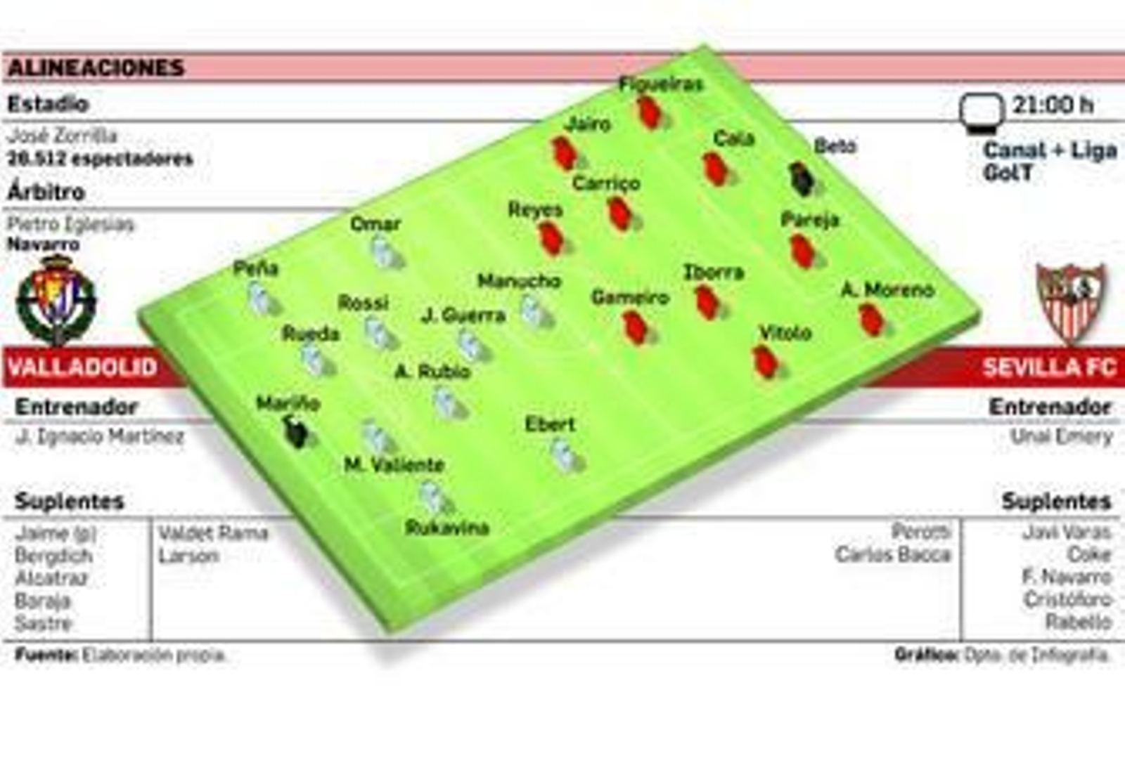 Enfrente estará un Valladolid que también acumula un sustancial número de bajas. Juan Ignacio Martínez se encuentra con que hay futbolistas, como Lluís Sastre o Javi Guerra, que están renqueantes, mientras que Ebert sale de una lesión y otros están descartados: Óscar, Heinz, Víctor Pérez y Osorio. Juan Ignacio Martínez, así pues, aúna necesidad con merma de efectivos, en un extraño paralelismo con el Sevilla de Emery, puesto que los blanquivioletas sólo han logrado en las primeras ocho jornadas un triunfo, en casa ante el Getafe (1-0). De los otros tres encuentros disputados al calor de los suyos perdió dos, en el debut liguero ante el Athletic (1-2) y ante el Atlético (0-2) y empató el otro frente al Málaga, que sacó de Pucela el mismo resultado que de Nervión (2-2).
