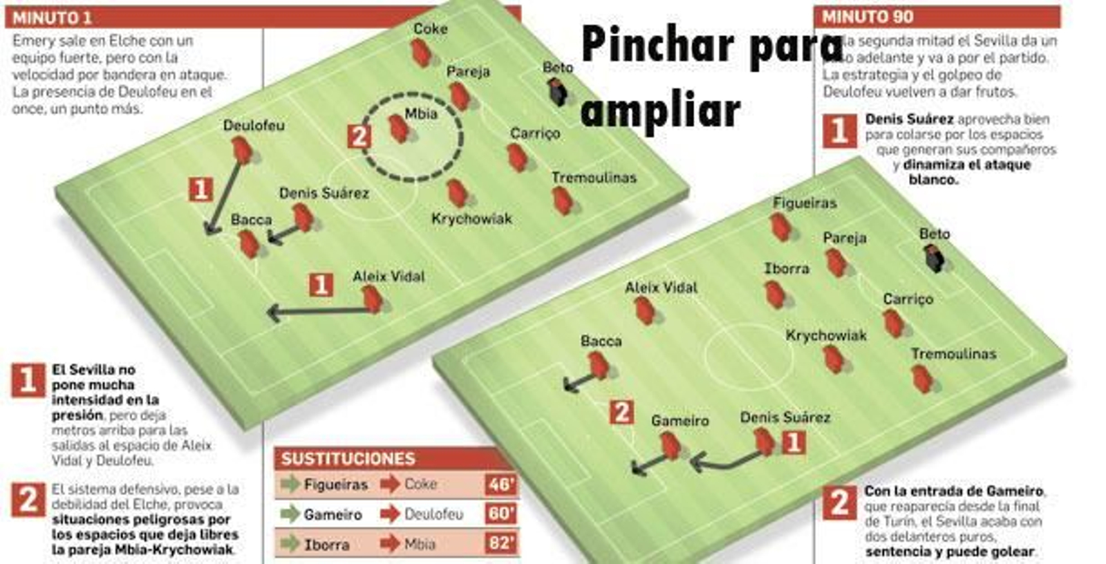 Un partido de fútbol se puede jugar a distintas velocidades. El Sevilla optó en Elche por no presionar con mucha intensidad arriba, por dejar madurar el partido, alargar el campo y aprovechar la salida rápida de sus jugadores de tres cuartos. Por eso fue titular Deulofeu, un hombre eléctrico que además tiene un magnífico último pase y que podía formar un trío explosivo con Aleix Vidal y Denis Suárez.