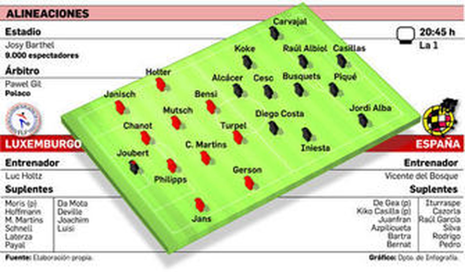 Porque Del Bosque tenía un plan de ruta que no se cumplirá. Su deseo era que jugasen todos los futbolistas de campo, que debutasen Juan Bernat en el lateral izquierdo, y Rodrigo Moreno formando de inicio en el tridente ofensivo. Y en principio no se producirá. Aunque hay margen para el error en una fase de clasificación a la Eurocopa que permite el tropiezo, España no está para bromas en Luxemburgo donde debe vencer y hacerlo con diferencia de goles para silenciar las críticas.