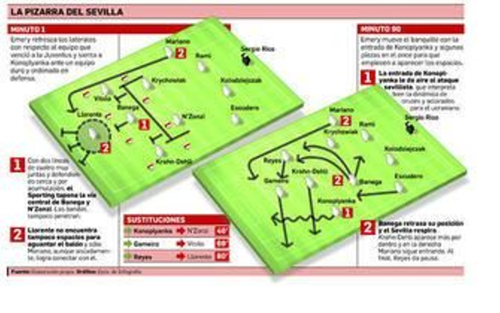 Emery, que dejó en el banquillo a un Konoplyanka que ante la Juventus había bajado el nivel, movió el banquillo para que los espacios empezaran a aparecer, una tarea que el técnico -con gran enfado- ya avisó de que no sería nada fácil.