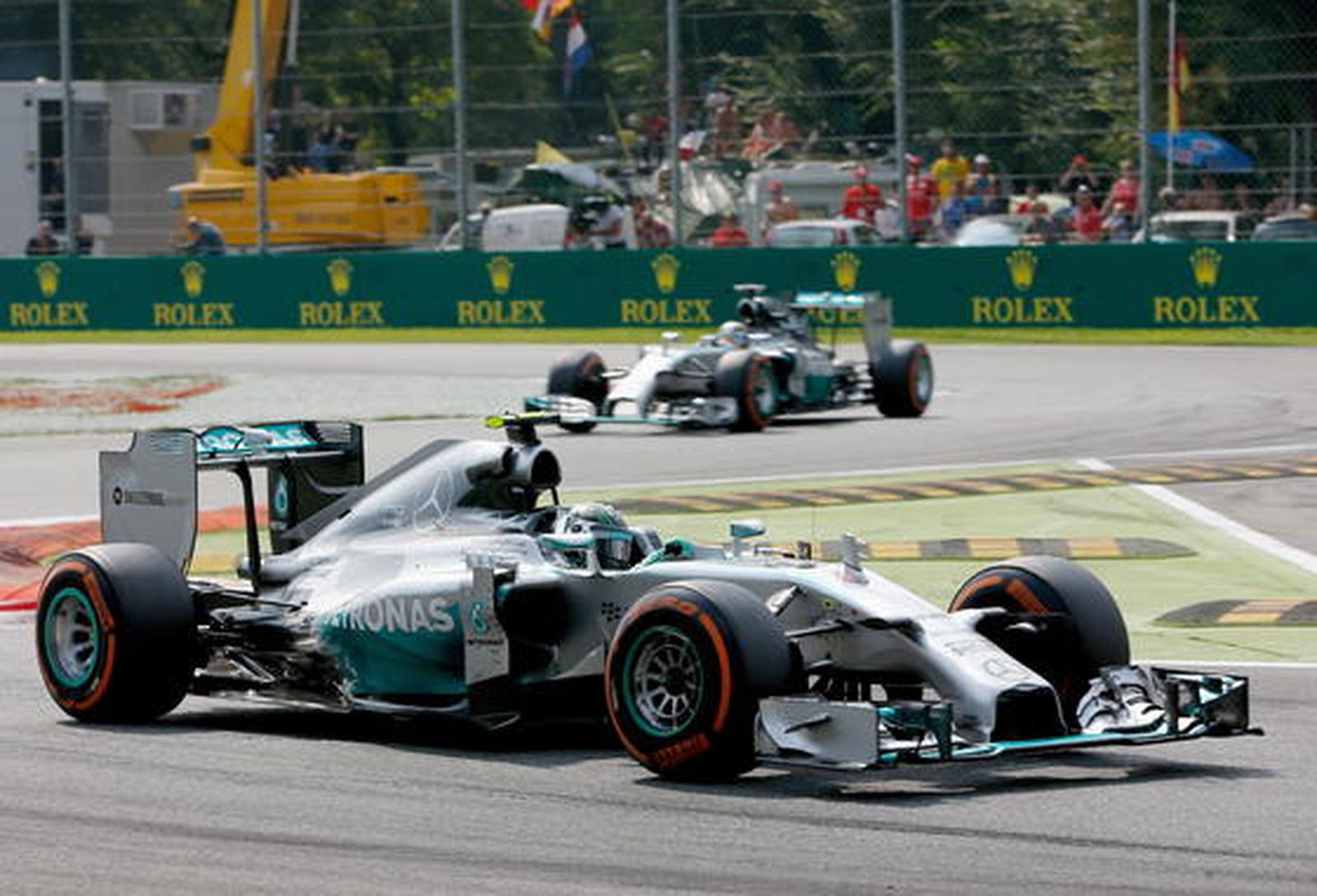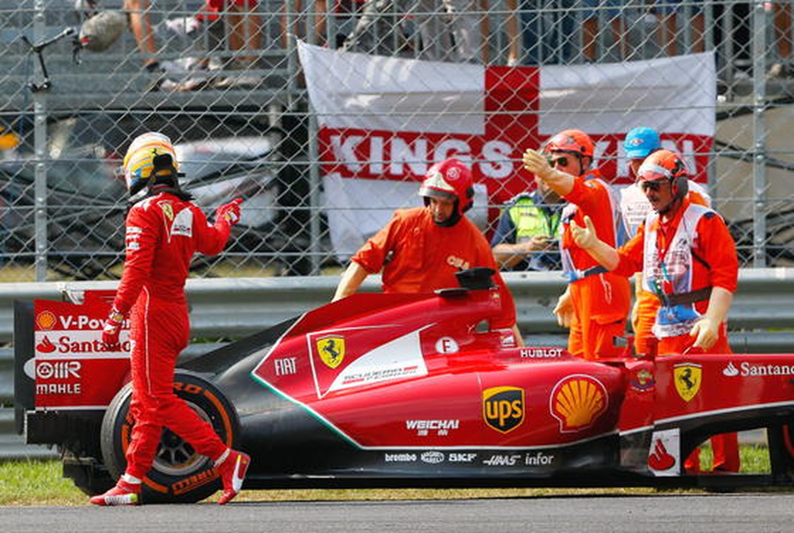 No le pudieron salir peor las cosas a Ferrari en casa. Los tifossi corroboraron en directo la caída de la marca del Cavallino Rampante. Alonso con problemas en el kers tuvo que dejar la carrera en la vuelta 29, finalizando así una racha magnífica de 29 Grandes Premios cruzando la bandera a cuadros y además sumando puntos en todos ellos. A pesar de la decepción, la afición italiana ovacionó a Alonso en su marcha, consciente de que la culpa de los pésimos resultados no es suya sino de la escudería. Prueba de ello es la novena posición de Kimi Raikkonen o la imagen de un podio en Monza copado por tres motores Mercedes.