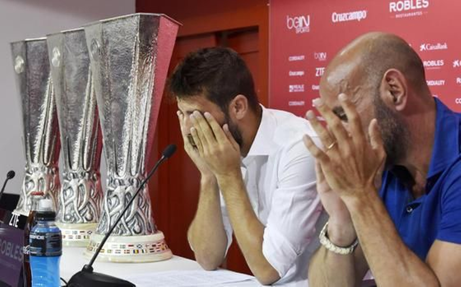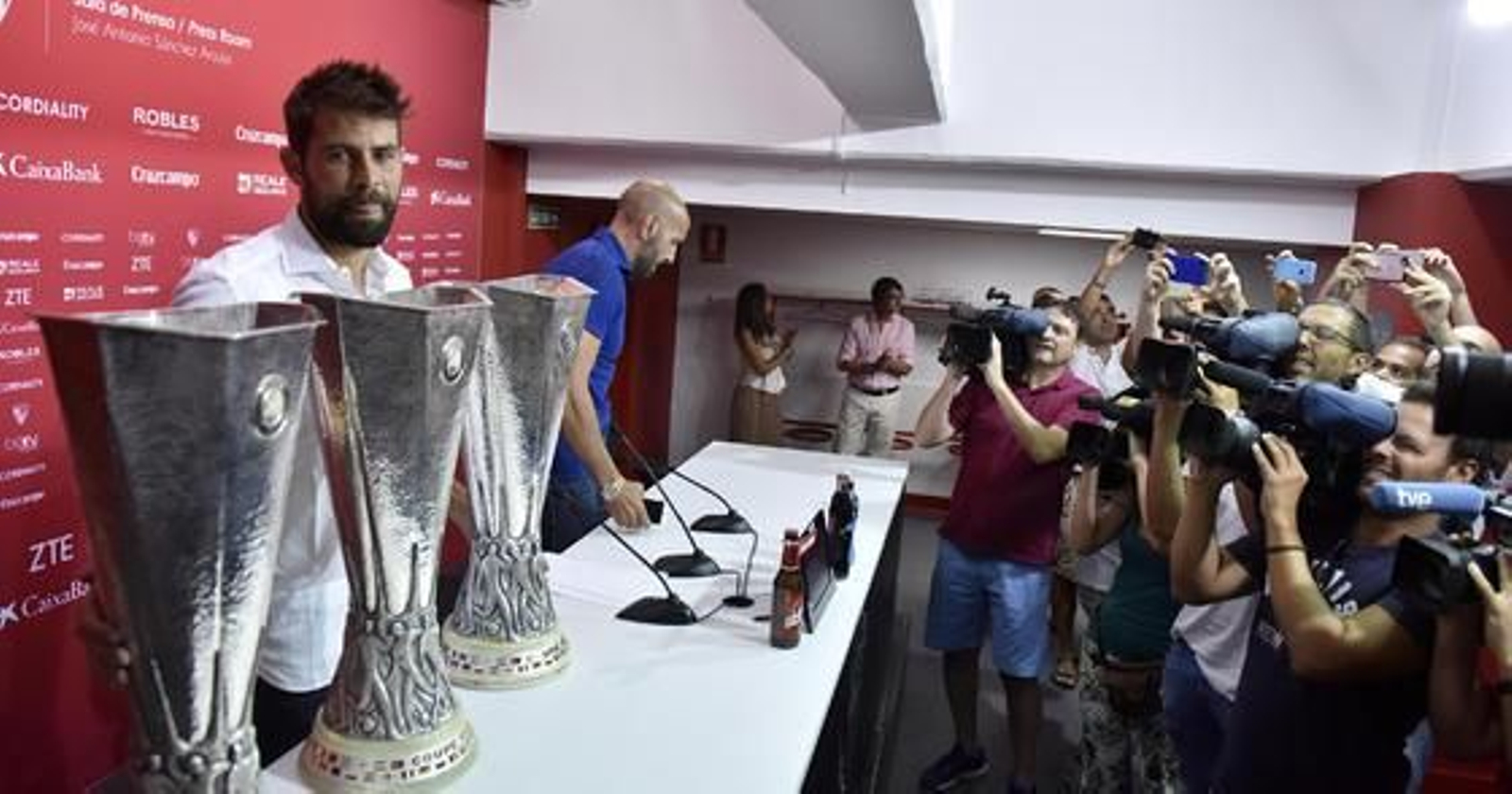 Llegó otro día de emoción en las entrañas del Ramón Sánchez-Pizjuán. Sin tanto boato ni tanto protocolo como en otras tantas ocasiones. Las obras del estadio contribuyeron, por casualidad, a hacer el adiós de Coke algo más íntimo y hasta más auténtico. La emoción era más cercana. La sal de las lágrimas y el azúcar de las carcajadas casi se saboreaban en el hermético escenario de la sala de prensa del coliseo nervionense, en el que nunca más volverá a dejar su marchamo de entrega, capacidad camaleónica y llegada al gol, de muy distintas formas, un lateral que llegó de Segunda División y se va como tricampeón de la Liga Europa, como el capitán más querido de la última era del Sevilla. De la universalidad de su carisma habla el distinto perfil de los compañeros presentes: Carriço, Pareja, Iborra, Cristóforo, David Soria, Vitolo, Llorente, Juan Muñoz... Todos lloraron, y rieron, con él.