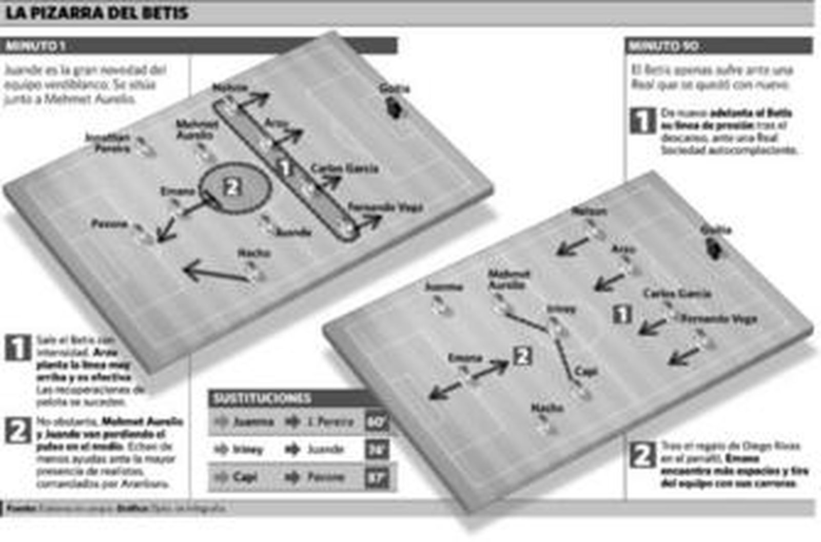 Jonathan Pereira no termina de ejercer de falso extremo. Es delantero puro y duro, y a pesar de que el Betis arrastró el balón hacia el costado derecho en sus primeras acometidas, el menudo punta no apareció para dar continuidad a los ataques. Por la otra banda, Nacho tampoco abrió caminos, mientras que Pavone perdía el pulso cada vez que recibía de espaldas. ¿Emana? Con Diego Rivas muy pegado, buscó algún socio para combinar y desmarcarse, siempre se ofreció pero sólo cuando la Real se quedó con diez, ya con 1-0, se desató el camerunés.