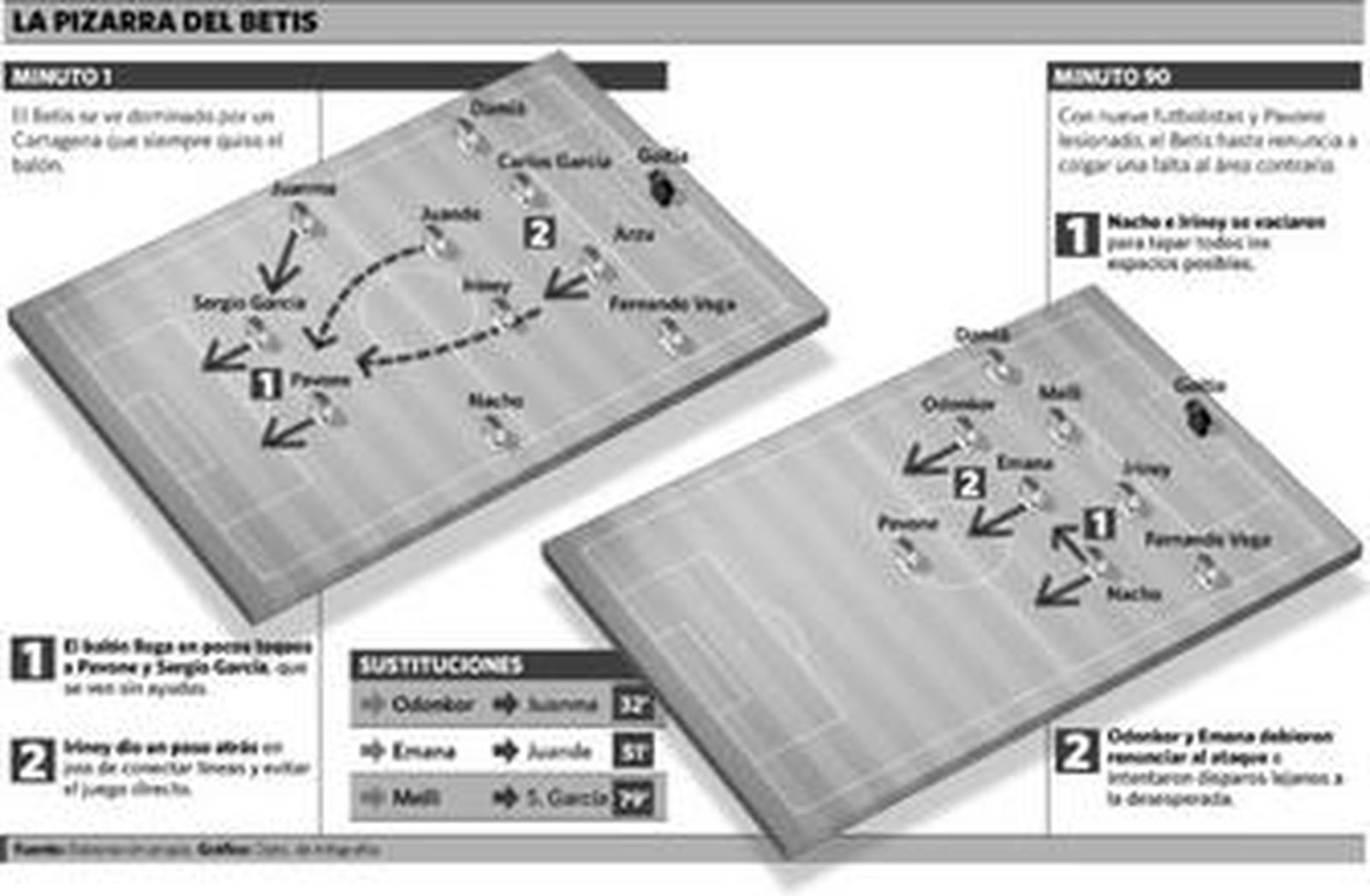 Tapia gestionó mejor el equipo cuando el árbitro lo desquició que con la lesión de Juanma, al introducir a Odonkor con gente como Emana y Nelson -Damià podría haberse adelantado- en el banquillo. Antes de todo, el Betis, con dos pases, creó sus ocasiones y se fue sacudiendo al rival, pero a raíz de ahí se ofuscó y volvió a perder el control en los medios.