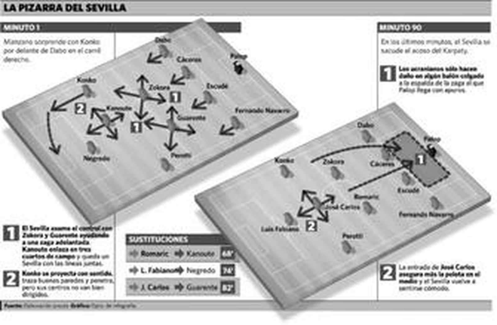 Sólo dos noticias positivas: Kanoute y Konko. El malí volvió a enlazar juego en tres cuartos de campo, y se encontró con un nuevo socio, Konko, quien actuó por delante de Dabo. Penetró, pero no centró bien. Al Sevilla le costó salvar la presión adelantada del Karpaty -el inconveniente de jugar con Zokora y Guarente- y el peligro fue casi exclusivo a balón parado.