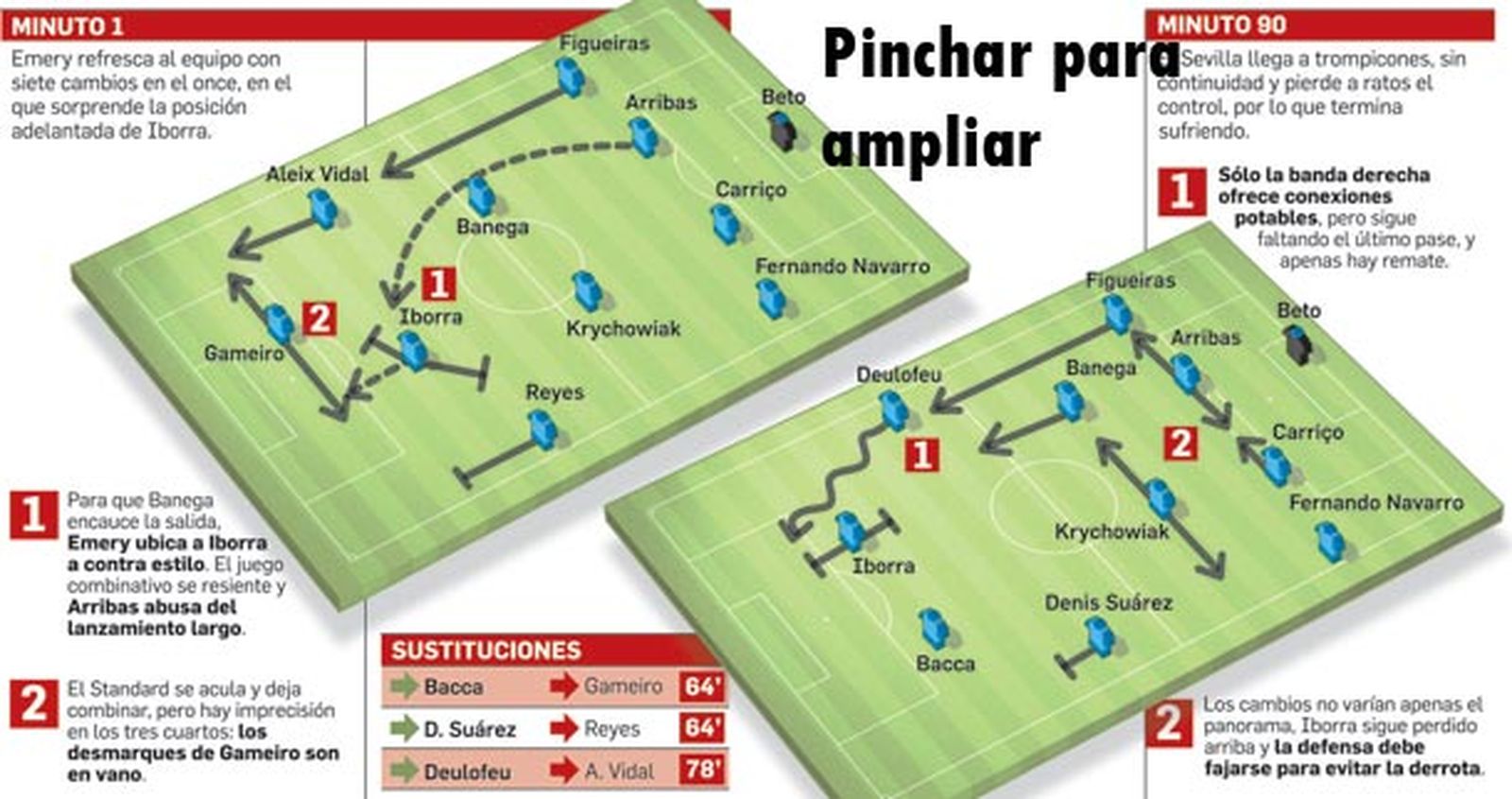 La limitación del Standard quedó patente. Los belgas no se soltaron casi nunca, salvo aislados contragolpes, casi siempre solventados por algún cruce oportuno de Krychowiak, el debutante Arribas, Carriço y hasta Banega. El Sevilla sólo sufrió verdaderamente a balón parado en el tramo final.