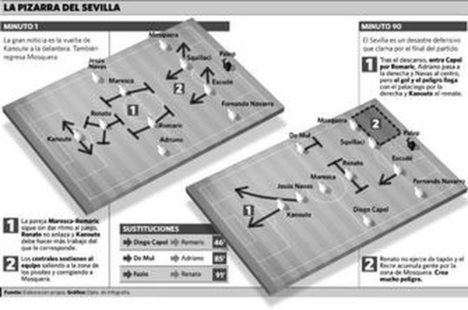Salió un Sevilla monocorde y apesadumbrado, incapaz de sorprender o acelerar. Lo impedía el fútbol pastoso de su eje integrado por Romaric, Maresca y Renato; una jugada aislada de Jesús Navas y Kanoute, dos clásicos del gran Sevilla, lo puso todo de cara.