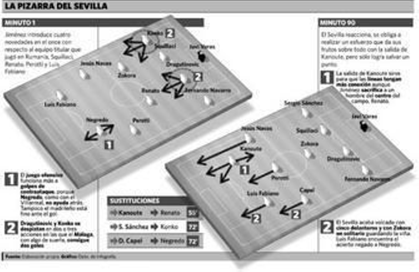 No es la primera vez que ocurre en casa y otra vez con Negredo en juego. Ante el Villarreal, el equipo de Jiménez perdió el control del centro del campo por esa falta de ayuda que los medios encuentran cuando se ven desbordados por un rival que puebla la zona ancha. El delantero madrileño, ocasiones falladas al margen, nunca ayudó a un gris Renato en la pelea con Apoño, un jugador que volvió a erigirse en dueño y señor de un Sevilla-Málaga. Esa rémora fue rebotando hacia la portería de Javi Varas en ese efecto dominó que acabó quemándole a Konko y en ocasiones a Dragutinovic.
