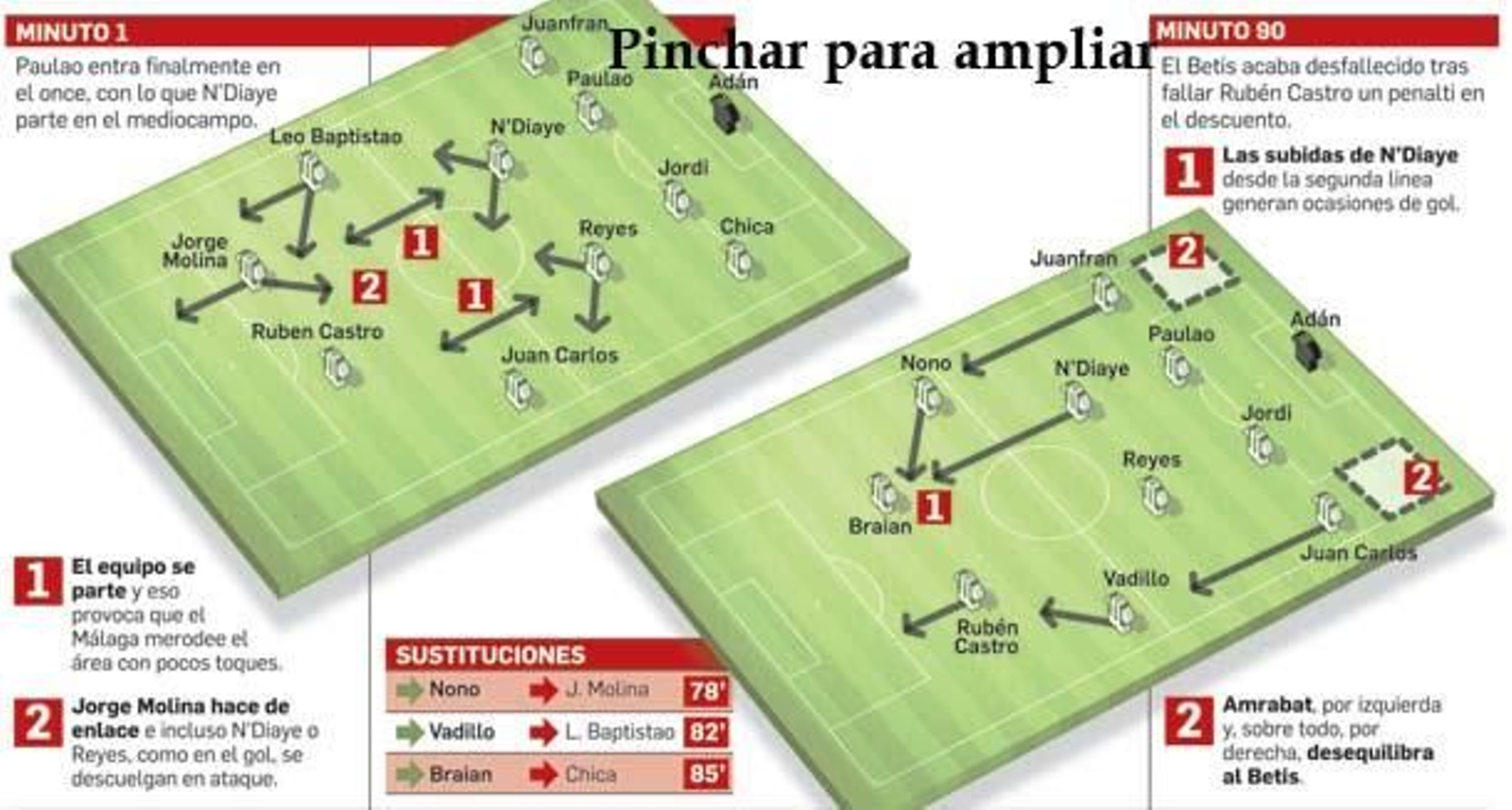 Con el marcador a favor y el Málaga asumiendo riesgos sí aparecieron espacios al contragolpe, en los que sólo la falta de eficacia tanto de Leo Baptistao como de Rubén Castro o incluso del propio N'Diaye evitaron que el cuadro verdiblanca lograse ese segundo gol que sí mereció.