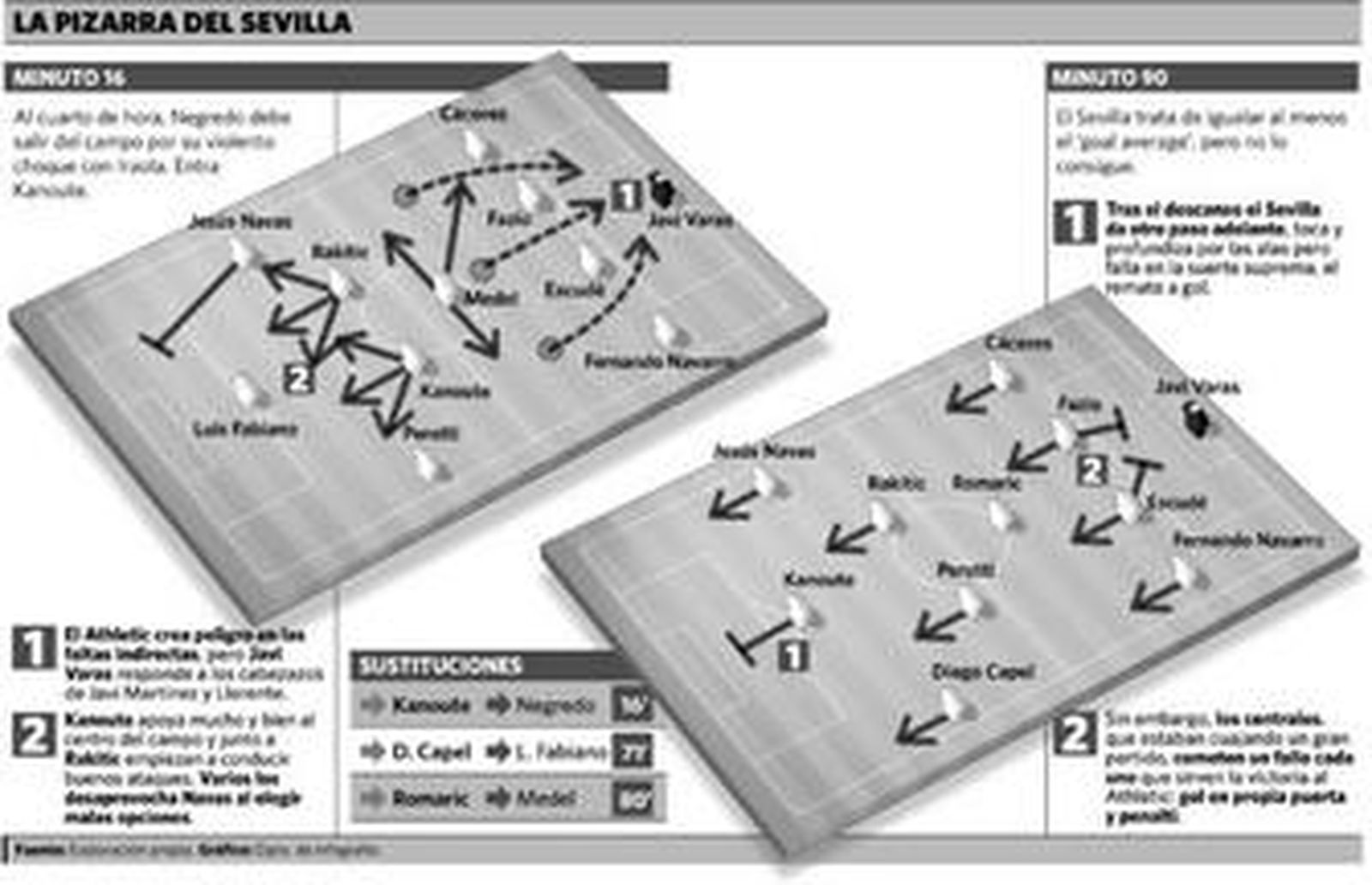 Los muchos supersticiosos que pululan en el fútbol deben buscar al gafe que anida en el Sevilla: que se lesionen los dos puntas el mismo partido... Pero el contratiempo de Negredo fue una zancadilla de la que se levantó el equipo, ya que Kanoute creó superioridad en el medio, junto a Medel y Rakitic, y el Sevilla se hizo con la pelota. Faltó que Jesús Navas eligiera mejores opciones: centrar en lugar de tirar, o centrar atrás y no arriba.