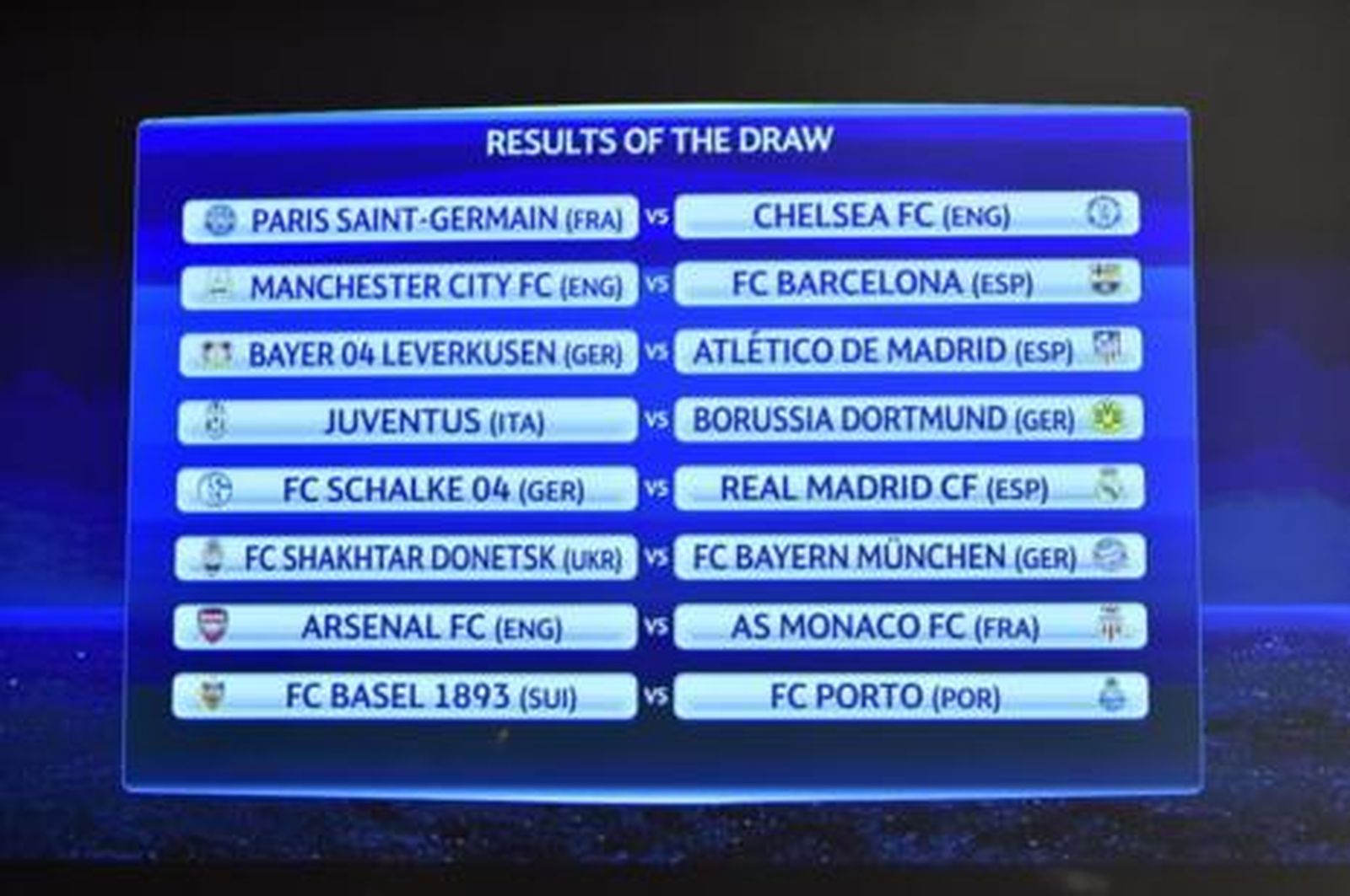 Manchester City-Barça, Bayer Leverkusen-Atlético y Schalke-Real Madrid, PSG-Chelsea, Juve-Borussia, Shakhtar-Bayern de Múnich, Arsenal-Mónaco y Basilea-Oporto, son todos los enfrentamientos que ha deparado el sorteo para octavos de final de la Liga de Campeones.