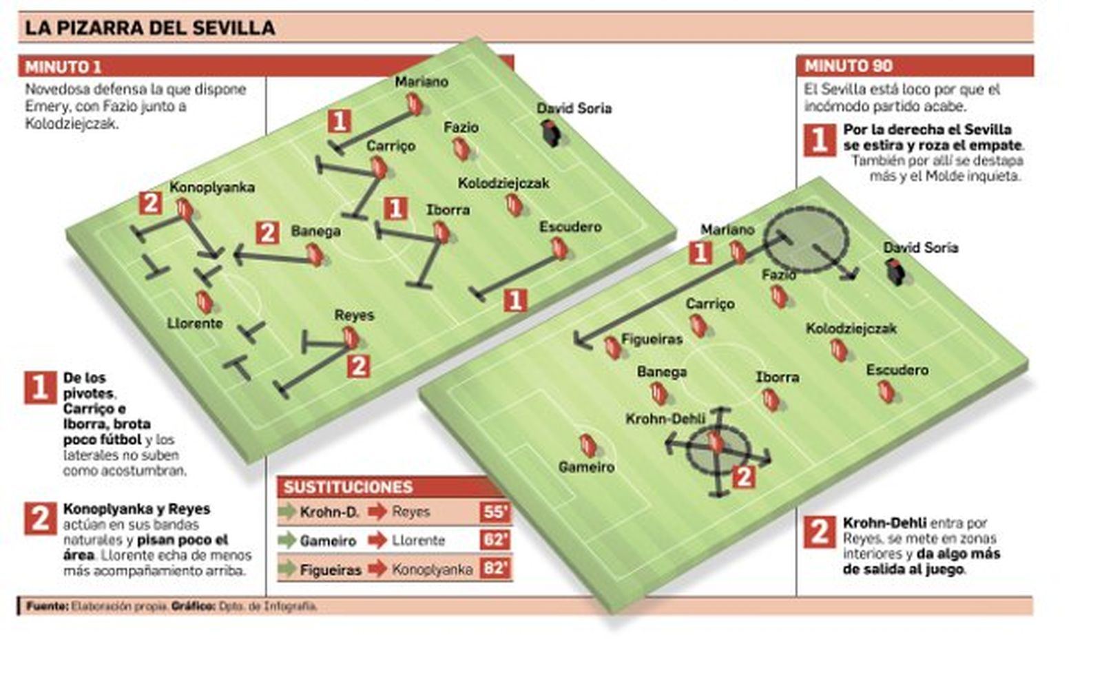 Unai Emery ha ahormado un equipo muy competitivo, que juega finales cada temporada y mora en el vagón de los mejores en la Liga con solvencia. Pero dentro de su competencia fuera de toda duda, mantiene batallas personales a pesar de que la realidad plasma la inconveniencia de las mismas. A saber: prefiere a Carriço como pivote defensivo, como demostró al meterlo en la segunda parte de Vallecas el pasado domingo, a pesar de que el portugués sigue con un tibio ritmo en sus piernas y su precisión en el pase es más que discreta; de vez en cuando, vuelve a las andadas con Konoplyanka en la derecha y Reyes en la izquierda, cuando son dos jugadores con querencia a conducir o buscar el pase interior, con sus piernas buenas, en la banda contraria; ¿Fazio? volvió a mostrar que le queda para recuperar ese óptimo nivel de hace dos temporadas, pero si no disfruta de minutos ante un equipo que sería de media tabla en la Liga Adelante, cuándo será.