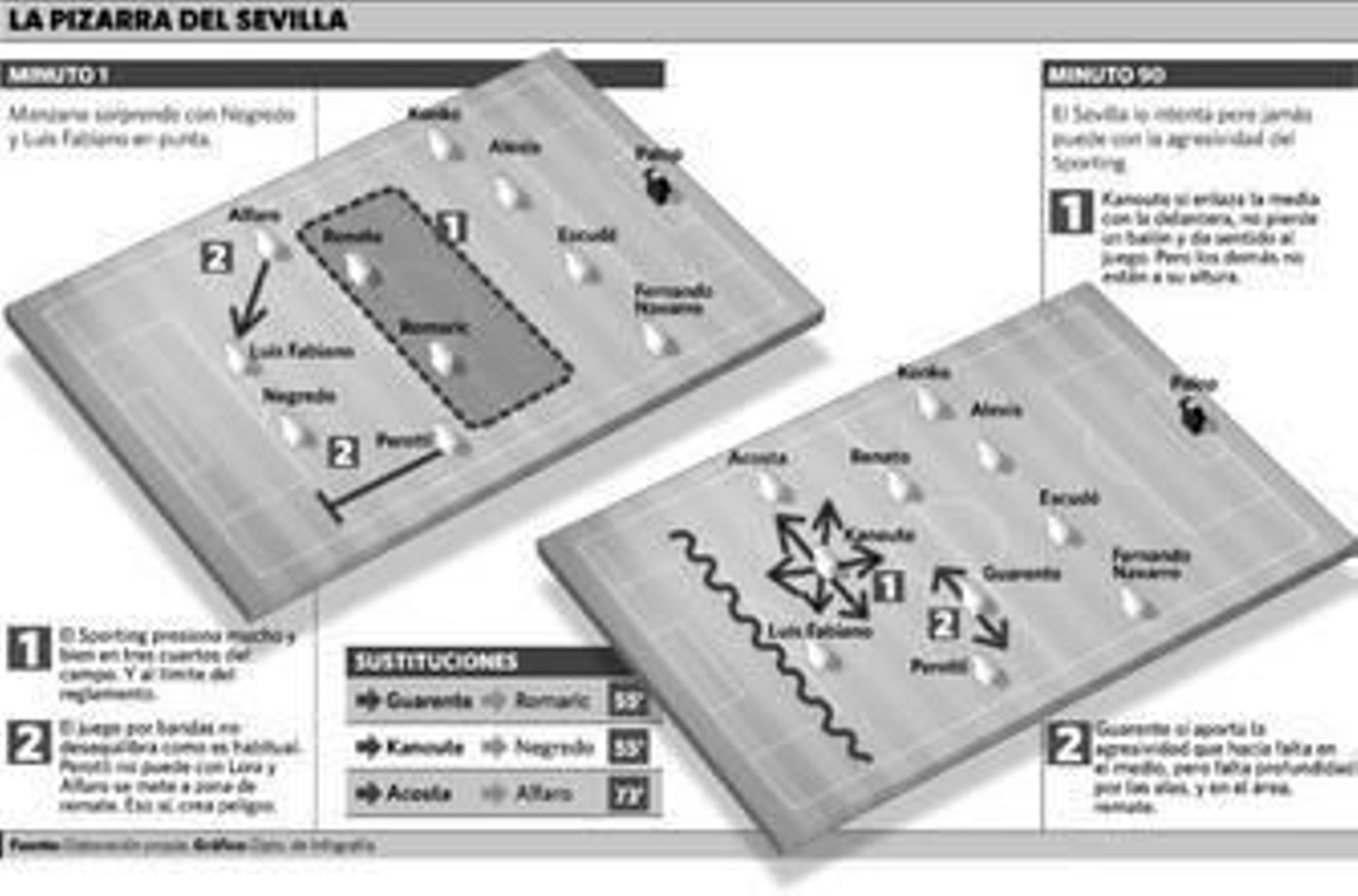 Renato y Romaric tuvieron dificultad para recuperar balones, pero en ataques elaborados desde atrás encontraron líneas de pase, sobre todo a Alfaro, que se descolgó hacia dentro para recibir y buscarse el remate. Está claro que la pareja Luis Fabiano-Negredo no cuaja, pisan los mismos terrenos. Con Kanoute en el campo hubo más trabazón en el medio y en tres cuartos de campo, pero el Sporting se pertrechó bien y Acosta, Perotti o Luis Fabiano no acompañaron al africano.