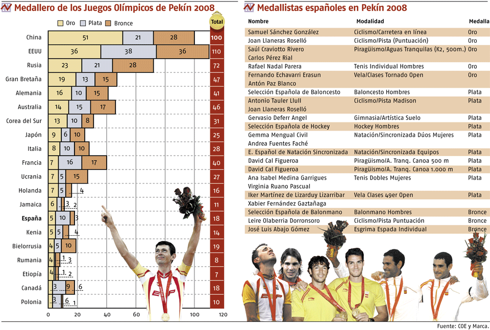 Los Juegos de Pekín también tuvieron mucho que ver en el año más dorado de la historia del deporte español. Y eso que no hubo mucho oro pekinés, sólo cinco medallas amarillas. Pero la cosecha de presas fue notable, la segunda mejor del olimpismo español. Después de aquel mayúsculo impulso que supuso Barcelona 92, con el récod de 22 medallas, la de Pekín quedará para los anales como la segunda mejor actuación: cinco oros, diez platas y tres bronces para acabar decimocuartos en el medallero.