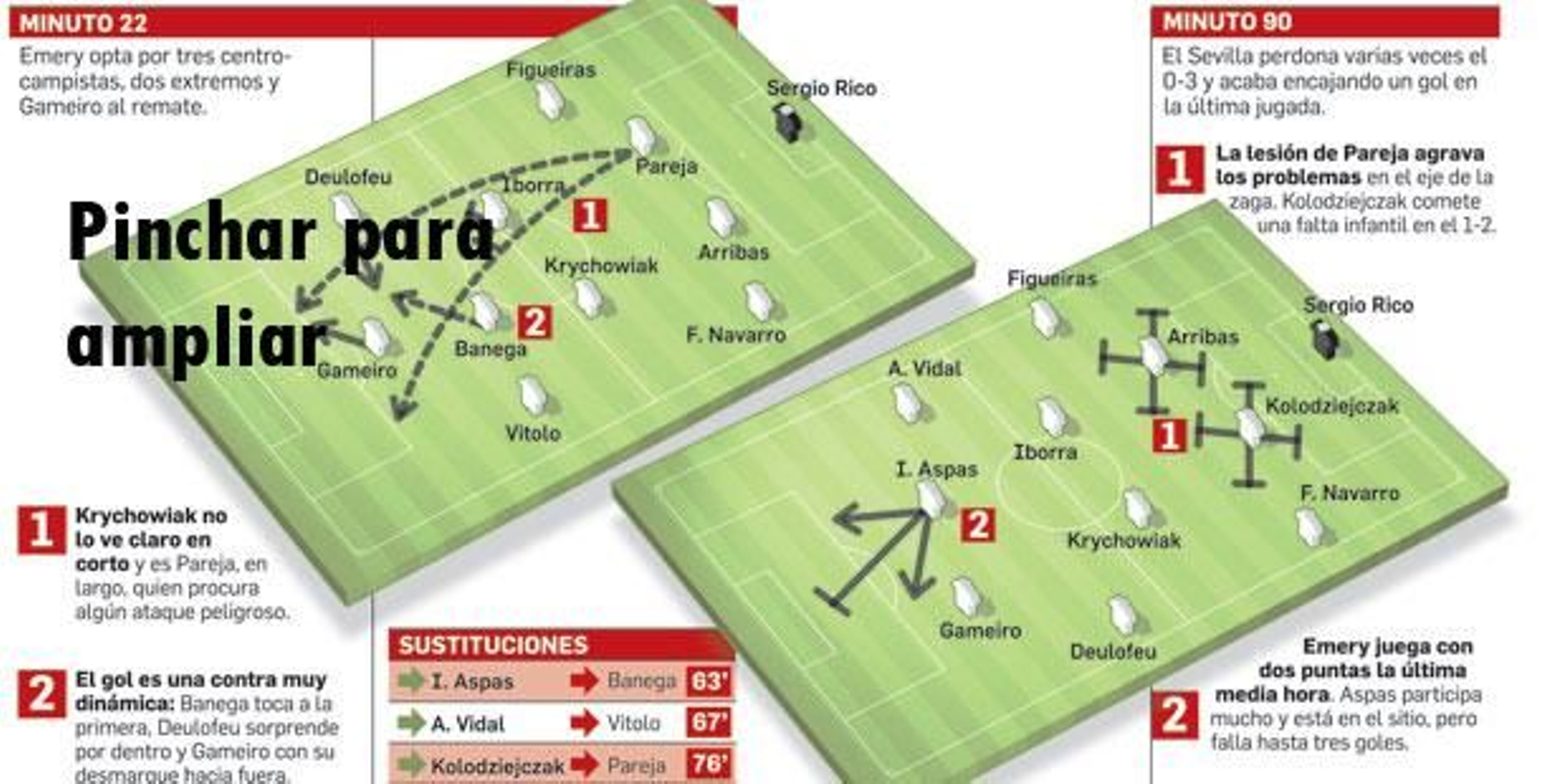 La entraga de Iago Aspas por Banega en la última media hora acentúa ese fútbol de contragolpe. El gallego juega bien sin la pelota y tiene intuición para ponerse de gol. Y eleva las prestaciones de Gameiro, que suele ver el pase cuando tiene otro punta al lado. Pero el ex céltico falló con el estoque. Por eso llegará vivo el Granada a Nervión.