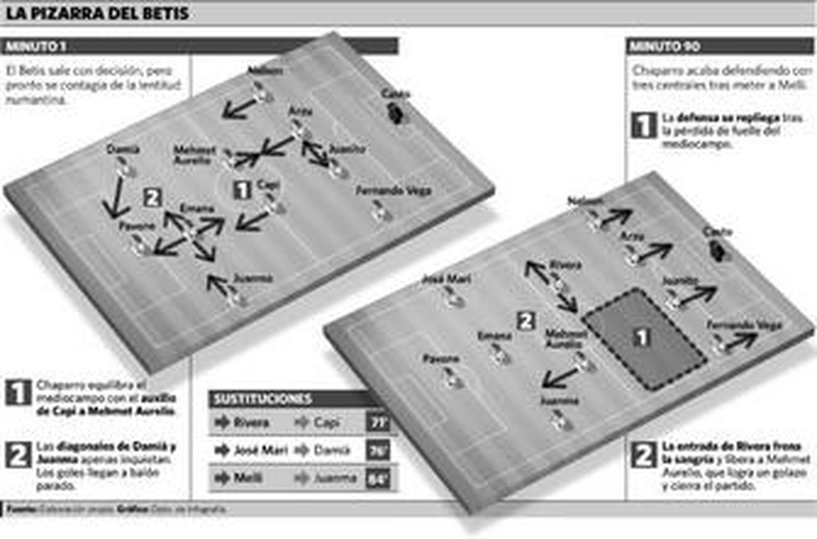 Dos goles tras jugadas a balón parado y otros tantos en sendos zapatazos de Aurelio resumen el juego ofensivo bético, huérfano de combinaciones y mínimamente aseado cuando Juanma condujo hacia el centro o Damià diseñó idénticas diagonales pero al espacio, sin balón. Poco más ofreció un Betis que malogró dos contraataques postreros para el 2-5 y que pretende en Pavone la referencia que éste apenas puede ser, por mucho que se harte a trabajar y hasta fuese a veces capaz de bajar el balón y jugarlo.