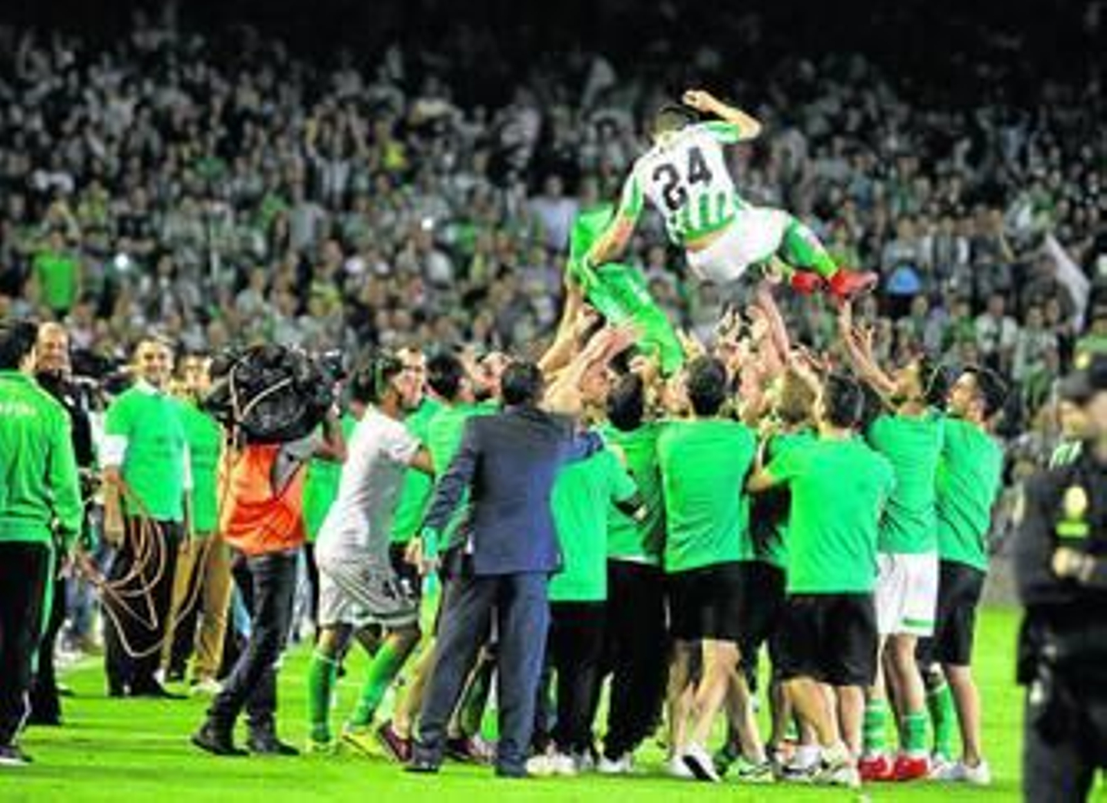 "Os lo debíamos, gracias afición", se leía en las camisetas que los jugadores portaron nada más terminar el partido. Era el reconocimiento a un año en el que los béticos volvieron a exhibir que nunca dejarán solo a su equipo. Desde Sabadell, donde comenzó la travesía en el infierno, a Santander, la última salida hace apenas unos días. La demostración de beticismo ha recorrido cada rincón de España. El Betis regresa a Primera, por duodécima vez, como campeón de la categoría de plata, los dos últimos con el sello de Mel, ese mismo que ya puso en pie al Benito Villamarín hace 25 años.