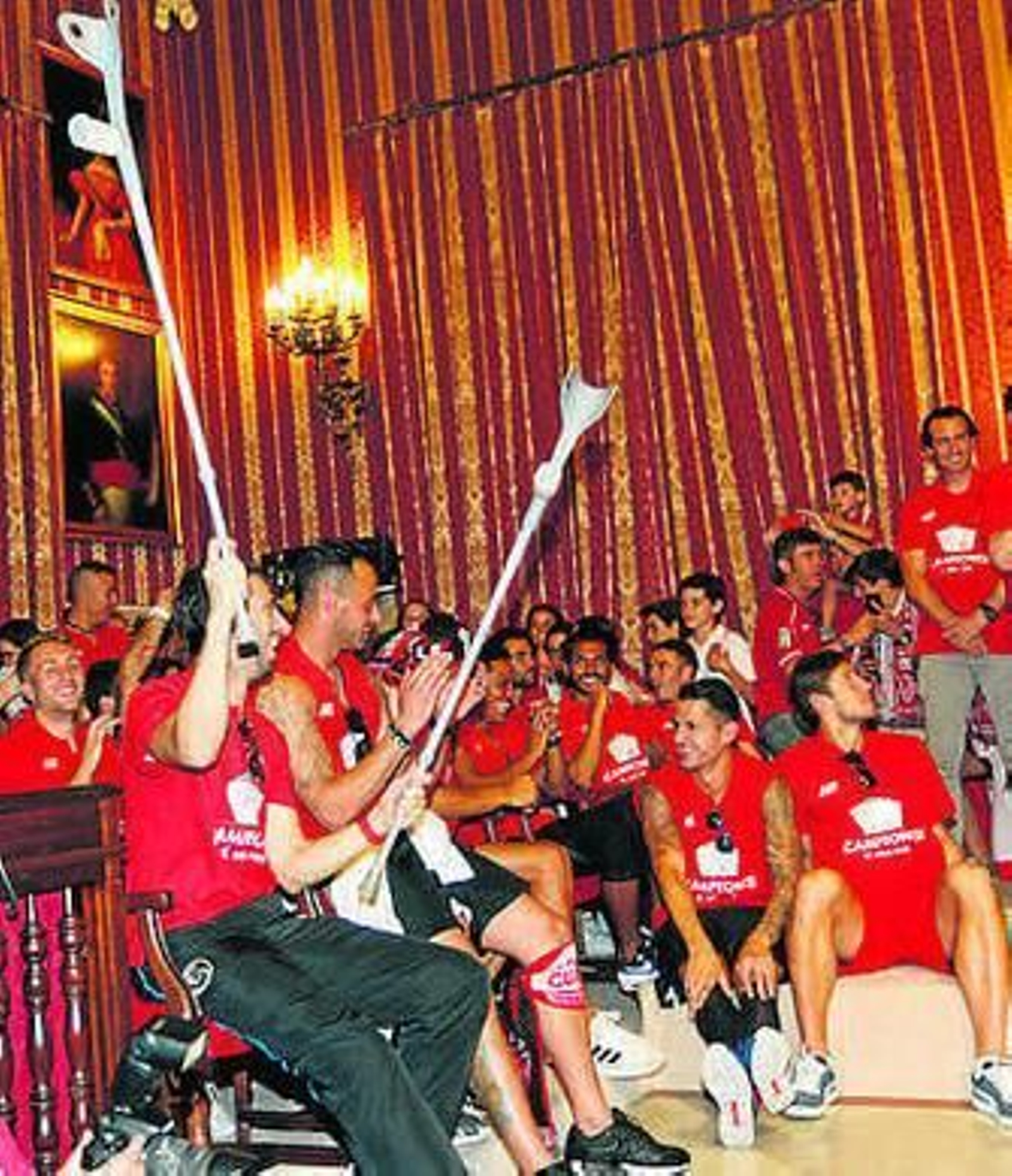 El Sevilla y su afición revivieron su historia, década tras década, y también sus títulos, incluidos los de la UEFA: Eindhoven, Glasgow, Turín... Varsovia. Los jugadores, emocionados y jocosos según la personalidad de cada uno, fueron también protagonistas activos. Intercambiaron cánticos con la afición. "Forza, Sevilla, campeón" se cantaban jugadores y afición, afición y jugadores, en un mutuo reconocimiento de sintonía y esfuerzo común. Hasta que José Castro y Fernando Navarro subieron el trofeo sin asas, el paragüero, la copa del Sevilla, del tetracampeón, hasta lo alto de la caja donde esperaba el grueso de la plantilla. Todos juntos, entre juegos de luminotecnia, entonaron la archiconocida We are the champions, The Queen en honor al rey de la UEFA. Tomó la palabra José Castro, ya casi afónico. "Hubo un tiempo en que nos preguntábamos, ¿por qué nosotros no podemos ganar un título? Y ahora nos preguntamos, ¿otra copa más? Sí, otra copa más". El estadio rugió.