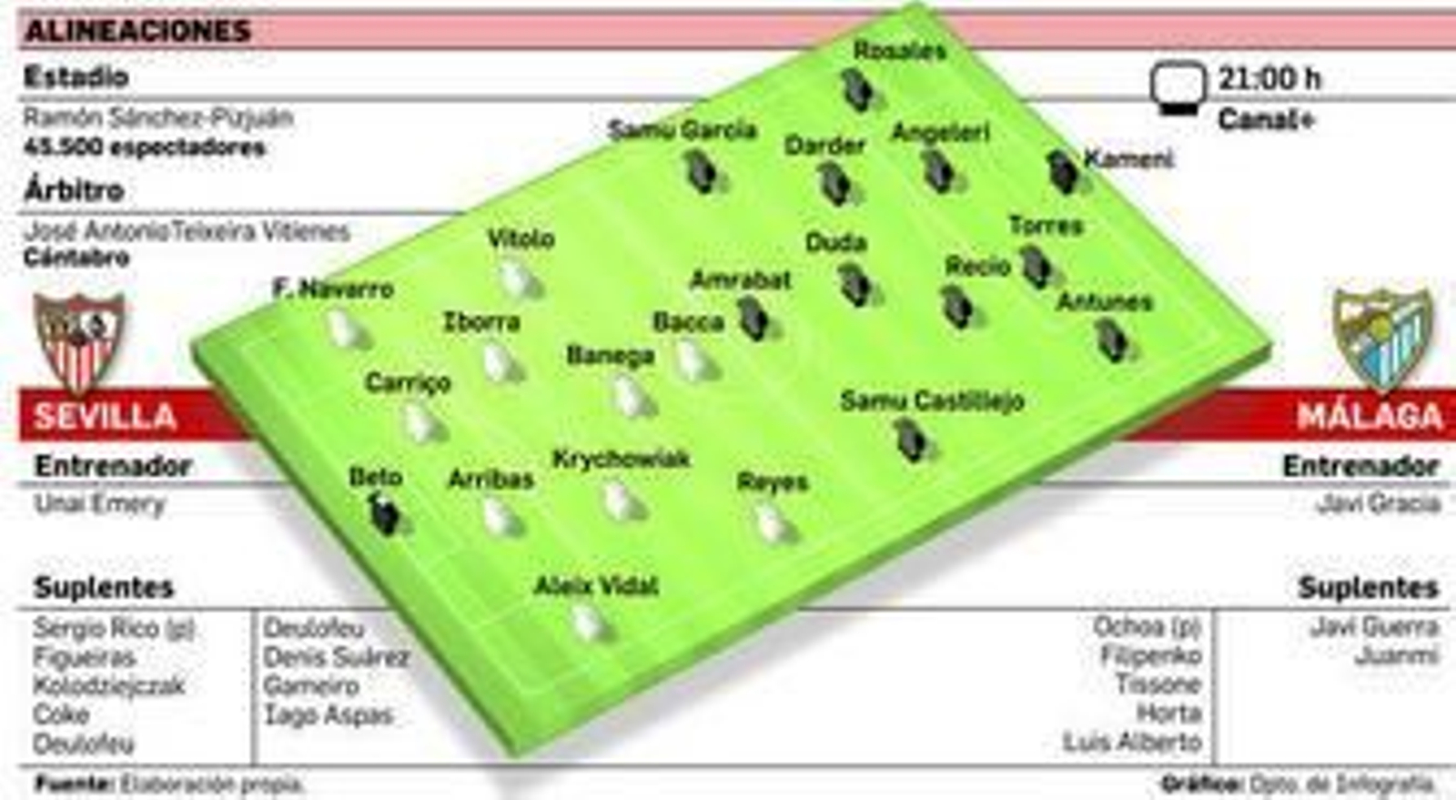 La naturaleza del rival, un Málaga para el que estos partidos suponen su máximo exponente de rivalidad geográfica, añade una pizca más de sal a este duelo marcado en rojo desde que el pasado miércoles el 4-0 al Granada parece que terminó por enganchar a los sevillistas más reticentes. Es un buen Málaga además, bien clasificado y en una de esas campañas en las que en La Rosaleda se puede percibir el olor a Europa, por lo que la motivación será doble en los blanquiazules, con jugadores en sus filas con ganas de demostrar cosas, como ocurre siempre con el portugués Duda y como en esta ocasión pasará con Luis Alberto, aquel prometedor muchacho que vio cortadas sus alas en la última fase de su formación aquí en el Sevilla. Barcelona y Liverpool fueron sus destinos antes de aterrizar en un Málaga en el que su talento tampoco acaba de asentarse del todo. Pero de igual forma, hay curiosidad por ver al de San José del Valle, al que la calidad le sale a borbotones si se pone en serio a esto.