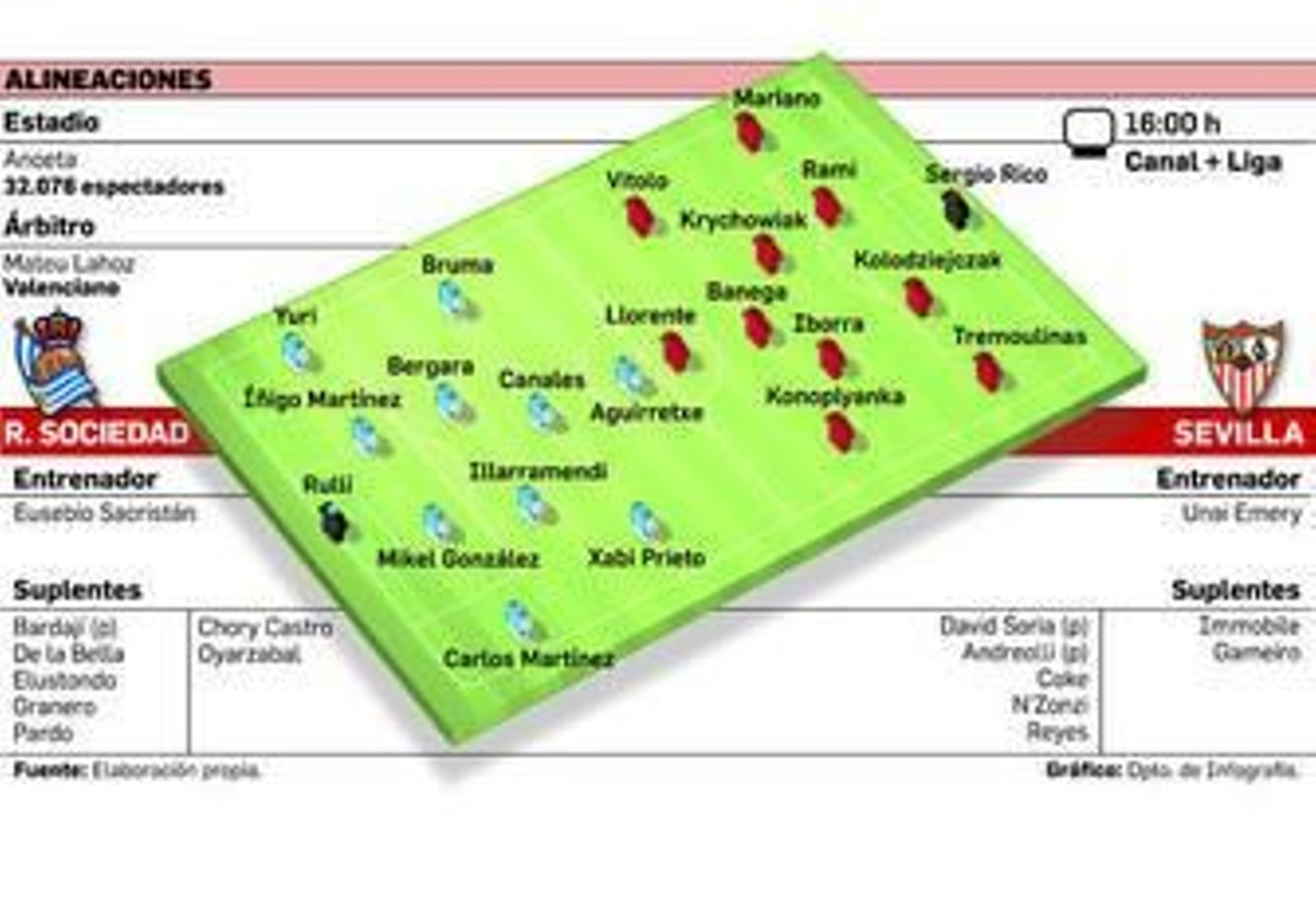 Además, en San Sebastián tiene el sevillismo fresca una mala experiencia. La forma en la que encajó una derrota el equipo de Emery la pasada campaña en este estadio aún pone de los nervios a muchos aficionados. Un doloroso 4-3 con Arribas de negativo protagonista cuando en el minuto 78 Gameiro había puesto en ventaja a los blancos con ese 2-3, de penalti, que parecía definitivo tras un gran esfuerzo para remontar. El Sevilla debió haber aprendido aquella lección. Más le vale porque tal y como ha expuesto su trayectoria foránea en la presente campaña adelantarse en el marcador como visitante no parece resultarle tan fácil como entonces. Para ello se lleva el de Fuenterrabía a su tierra a los tres delanteros de que dispone tras la vuelta de Gameiro, quien acompaña a los dos goleadores ante el Madrid, Immobile y Llorente.
