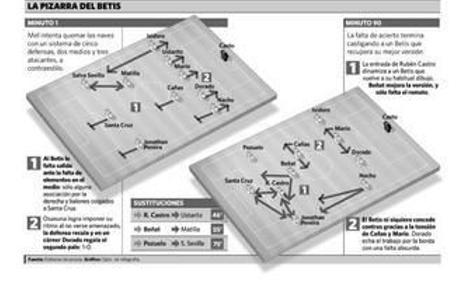 Con el 5-2-3, el Betis no tuvo salida. Si acaso, algún balón colgado a Santa Cruz para que peinase a Jonathan Pereira, como en la falta que Salva Sevilla estrelló en el palo (minuto 7). Faltaba gente en la medular para realizar el juego combinativo al estilo de Matilla o Salva Sevilla. Y los laterales apenas subieron pese a estar arropados por tres centrales. Nula llegada. Todo varió con el cambio al 4-1-4-1. Rubén Castro dinamizó el ataque, Salva Sevilla dejó la banda y distribuyó junto a Beñat por delante de Cañas y Jonathan Pereira y Santa Cruz se asociaron con verticalidad. El zafarrancho sólo dio para el empate y la lesión de Salva Sevilla terminó dejando al Betis algo romo.