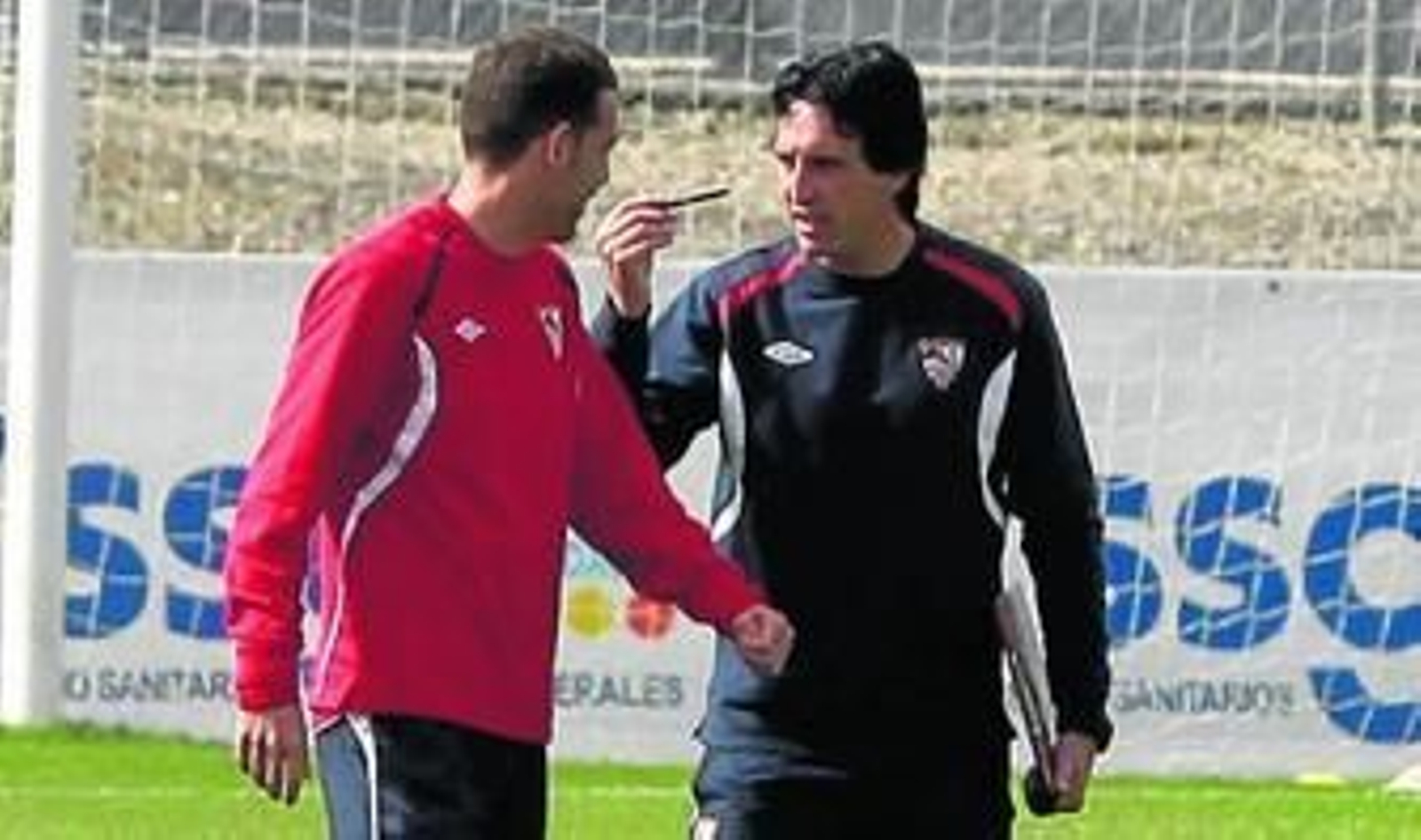 Fernando Navarro y Unai Emery bromean en la sesión de ayer.
