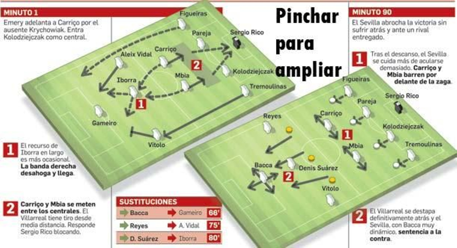 Esta vez no funcionó de forma tan determinante el juego en largo a Iborra. Volvió a ganarlas casi todas, pero la continuación de las jugadas no fue tan eficaz como en El Madrigal. Vitolo, Aleix Vidal y Gameiro perdieron muchas de esas pelotas ante sus pares. En la segunda parte, cuando el Villarreal se destapó atrás, con la línea casi en el centro del campo, el Sevilla agradeció la entrada de Bacca para asestar el golpe de gracia: los pasillos hasta Asenjo se multiplicaron y se colaron el colombiano, Iborra, Tremoulinas, Figueiras y luego Denis y Reyes.