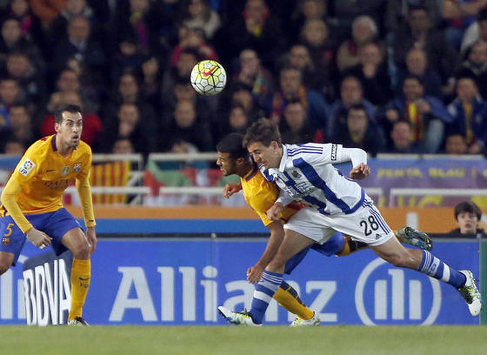 Las cosas se le pusieron negras casi de inicio a los catalanes porque, en la segunda jugada trenzada por los donostiarras, un medido centro de Xabi Prieto a la cabeza del joven Oyarzabal era cabeceado a gol por el último talento surgido de Zubieta ante la cara de incredulidad de Luis Enrique, que empezaba a no ver nada claro un triunfo de su equipo. Los guipuzcoanos se lo creyeron y el Barça estuvo a su merced durante el primer cuarto de hora, en el que se las veía y se las deseaba para frenar las acometidas locales dirigidas casi siempre por el mexicano Carlos Vela.
