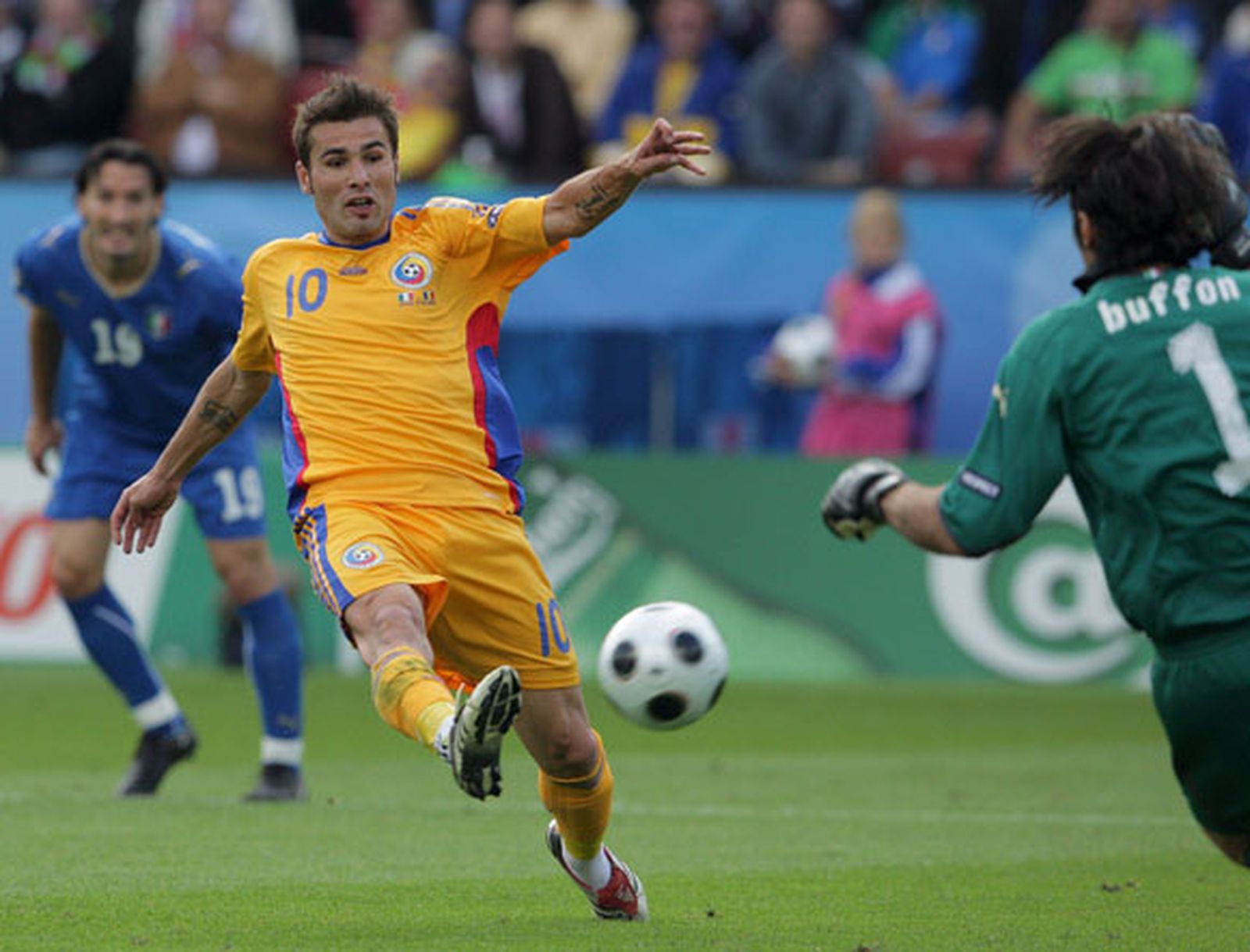 Quedaban minutos, pero Donadoni seguía empeñado en jugar en un duradero minuto 90 sin protegerse atrás. Y a punto estuvo de pasarle factura. La pelota seguía sin entrar, y en el minuto 80, el árbitro pitaba un riguroso penalti de Panucci a Niculae. La tragedia parecía inevitable. Mutu era el encargado de lanzarlo. Un valor casi seguro para poner a tiro la clasificación rumana, pero Buffon tenía algo que decir. Se lanzó a su izquierda, paró con la mano y luego con el pie para frustrar a media España, que se hacía la boca agua con un hipotético cruce con los rumanos en caso de pasar primeros a cuartos.