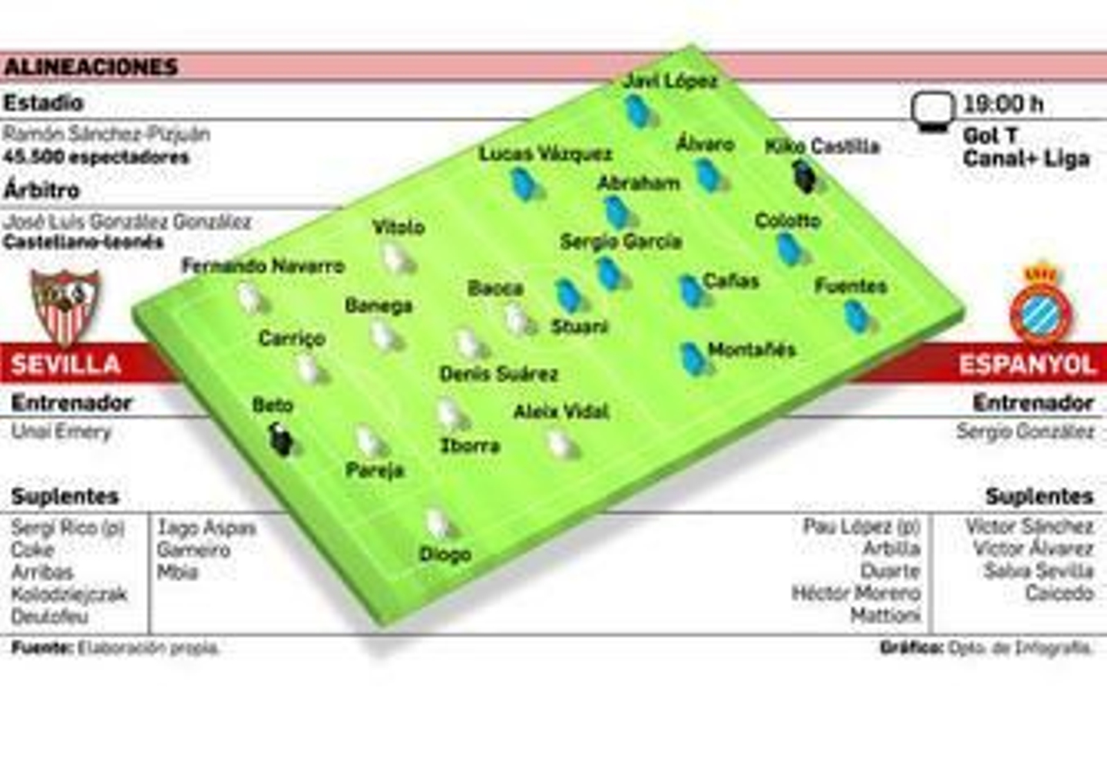 Sin tres de sus futbolistas más importantes, el técnico de Fuenterrabía deberá recomponer un once en el que está descartada la infructuosa apuesta por el dúo de delanteros. Banega debe tener sitio como titular para intentar darle pausa y ritmo al juego, para no atropellar el fútbol y buscar los escasos resquicios que concederá el Espanyol. Que sea como medio centro o como mediapunta ya dependerá del respeto que Emery les tenga a las peligrosas contras que puede montar el Espanyol con Sergio García y Lucas Vázquez como comandantes principales, sobre todo teniendo en cuenta que Pareja, desde su lesión muscular, ha perdido algo de su nivel y tampoco es cuestión de desguarecer la defensa. El once, una vez más, es una incógnita. Pero sea cual fuere, debe primar la cabeza sobre el corazón, el fútbol sobre el afán de revancha. Porque, no está de más recordarlo, sólo es el segundo partido de la segunda vuelta y el Sevilla es quinto, a dos puntos del cuarto...