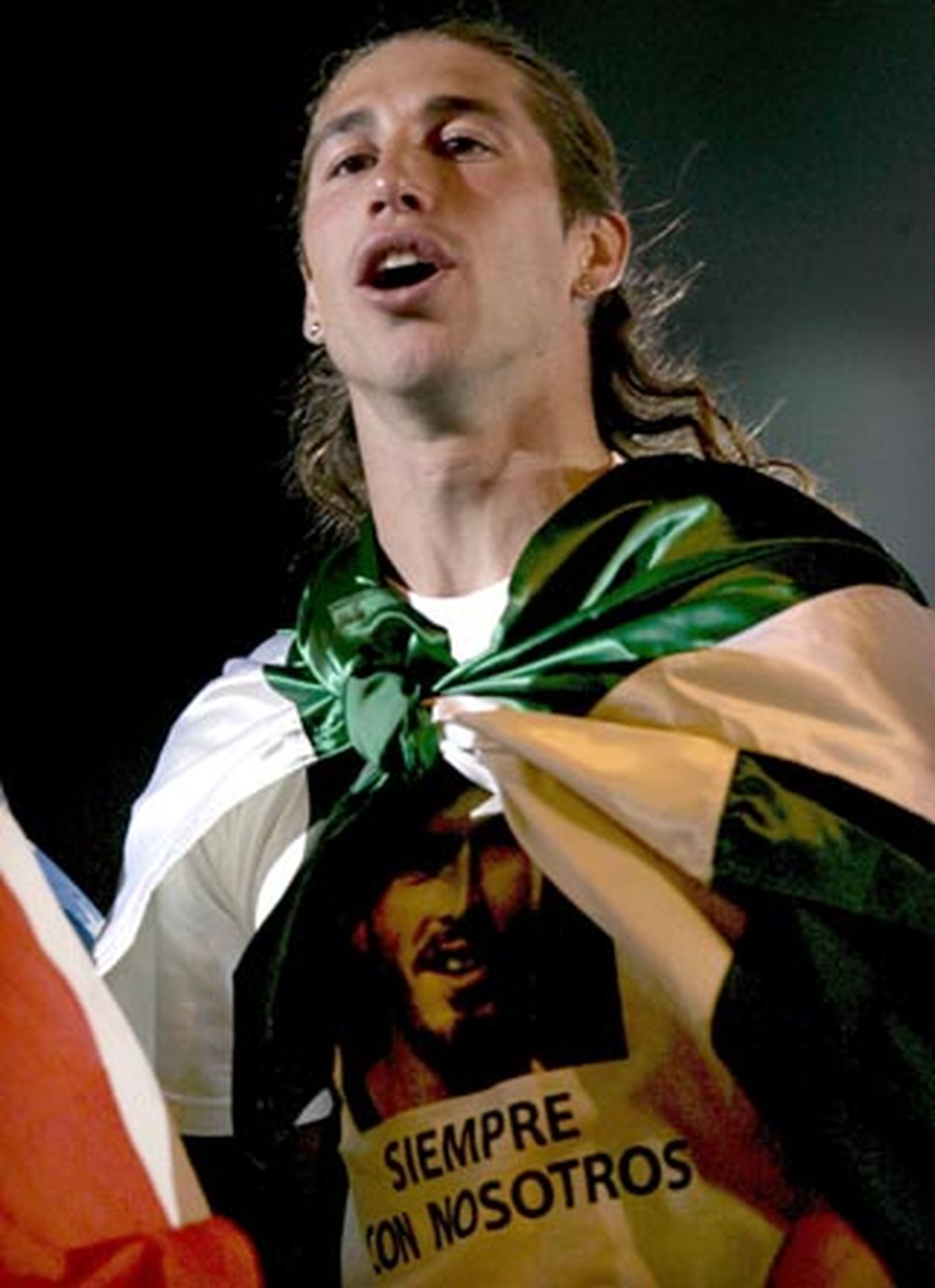 Ramos, que llevaba anudada al cuello la bandera autonómica de Andalucía, vestía una camiseta blanca con una fotografía de Antonio Puerta y la frase "Siempre con nosotros".