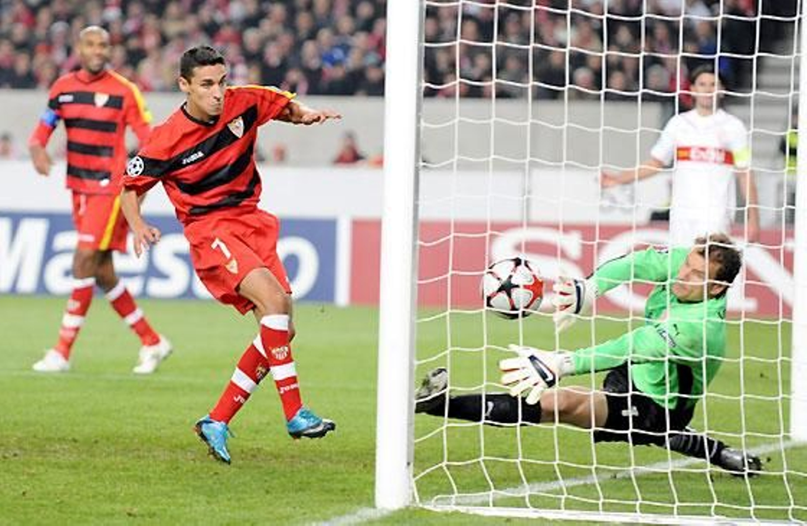 El partido pareció volverse loco, y a renglón seguido le tocaba al recién entrado Elson marcar el del honor de su equipo, con una magistral falta que entró por toda la escuadra. Admirable, el Stuttgart, noqueado un momento antes, sacó fuerzas de flaqueza y no sólo volvió a encerrar al Sevilla, sino que pudo empatar perfectamente con dos nítidas ocasiones, incluido un remate al larguero. Pero ya no hubo tiempo más que para certificar otro triunfo de los sevillistas que, de paso, se aseguran también, prácticamente ser líderes de grupo.
