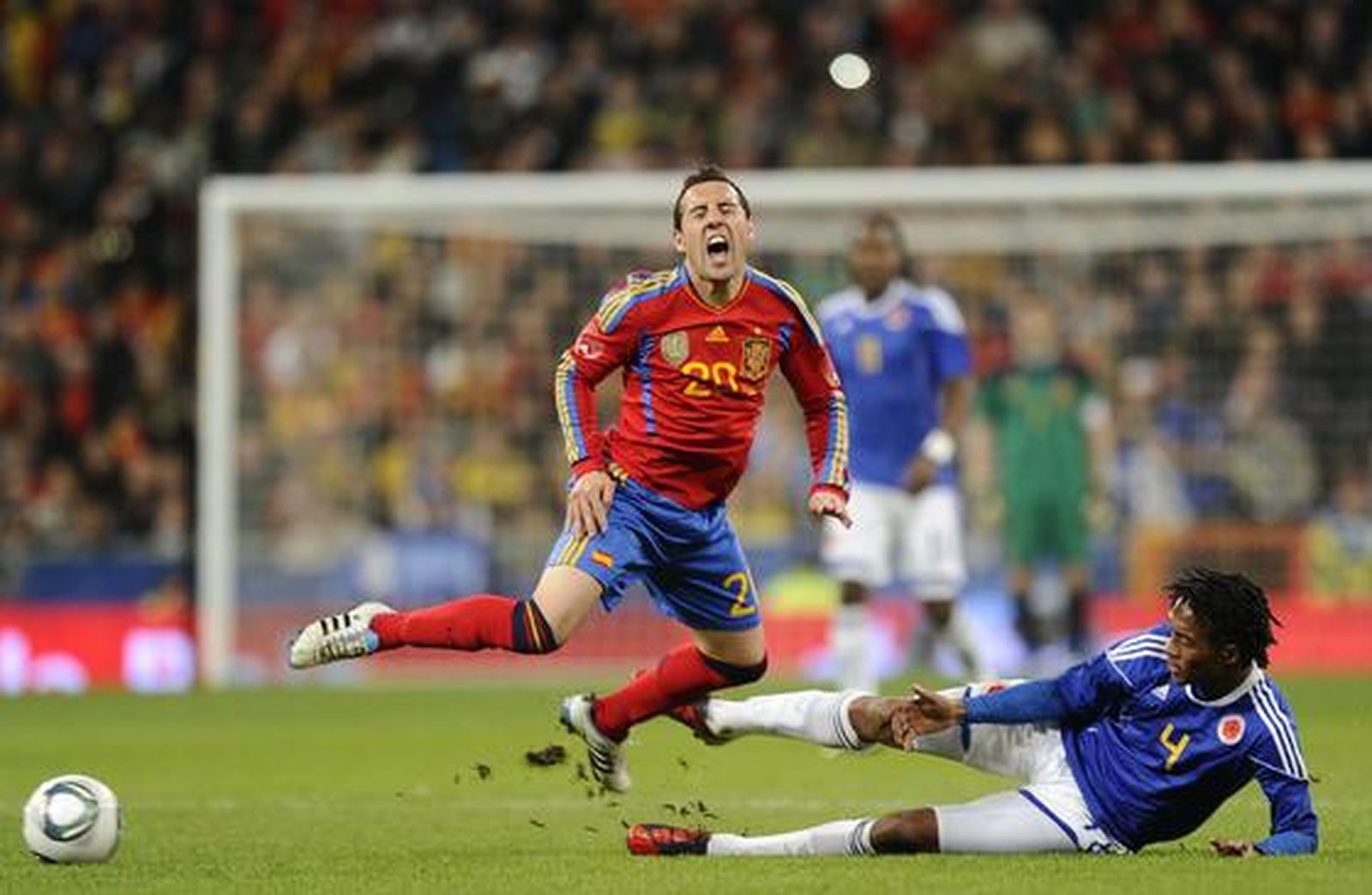 Sólo dos minutos después España tuvo su mejor ocasión, cuando David Villa afrontó un mano a mano ante Ospina, superó al arquero y envió el balón al palo. El rechazo fue hacia el punta español, quien mandó fuera en segunda oportunidad.