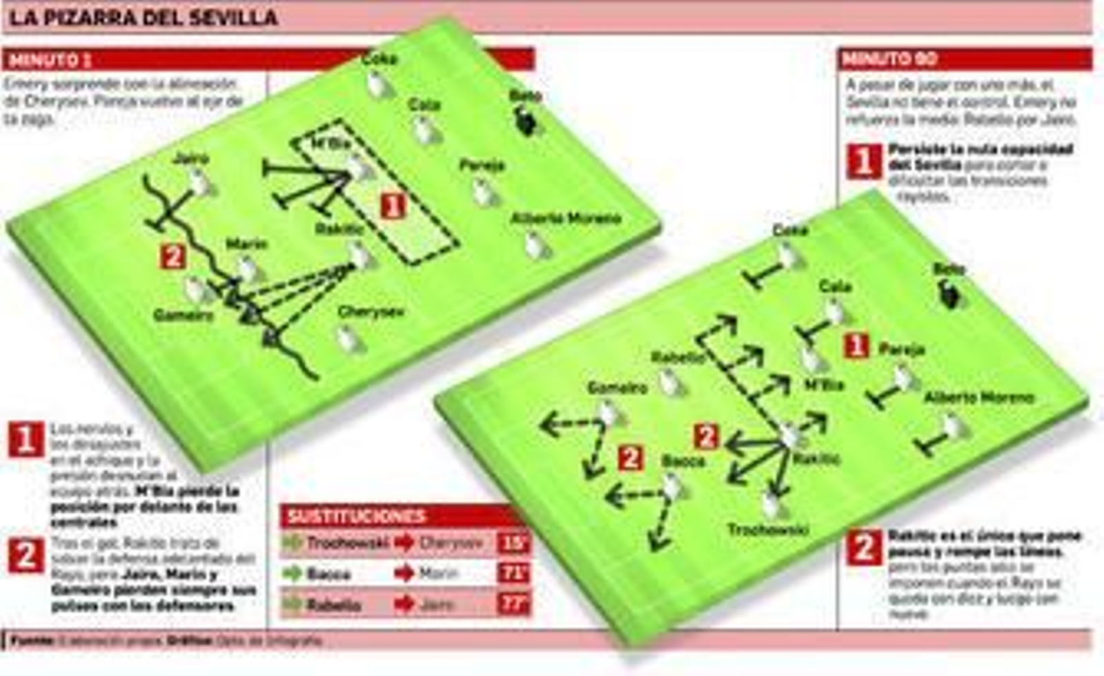 La debilidad atrás impidió el control en el medio a pesar de la clarividencia y el pase de Rakitic. Los mediapuntas volvieron a naufragar y en ataque, el Sevilla echó en falta más físico para ganar las disputas, los balones divididos, cuando el suizo-croata aparecía o lanzaba en largo ante la adelantada zaga rayista. Jugando al espacio, al desmarque, Gameiro sí hizo daño. Ya con Bacca y el Rayo debilitado y entregado, todo se aclaró.