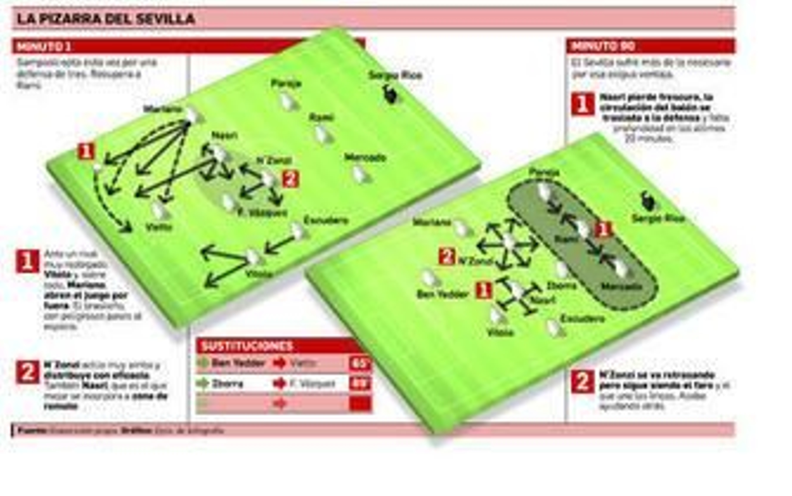 Jugar al pie tanto como lo hace el Sevilla de Sampaoli era mal plan ante un enemigo tan replegado. Cierto es que los espacios eran mínimos. Pero había que generarlos. Y eso, cada uno a su estilo, bien que lo hicieron N'Zonzi (rompiendo las líneas con arrancadas o pases al espacio, por fin al espacio), Nasri (también con pases a las zonas adecuadas y ofreciéndose para el remate, como en el gol), Mariano (desdoblamientos y, también, pases al espacio) y Vietto (movimientos de arrastre, desmarques...).